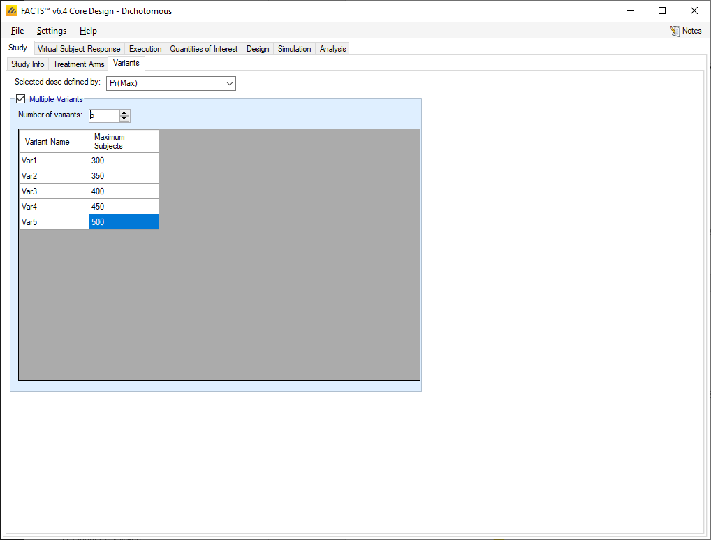 The user enters the number of variants they wish to create. Then in the resulting table, enter different “Maximum Subjects” for each variant. On the simulations tab FACTS will then create a copy of all the scenarios to run with each variant.
