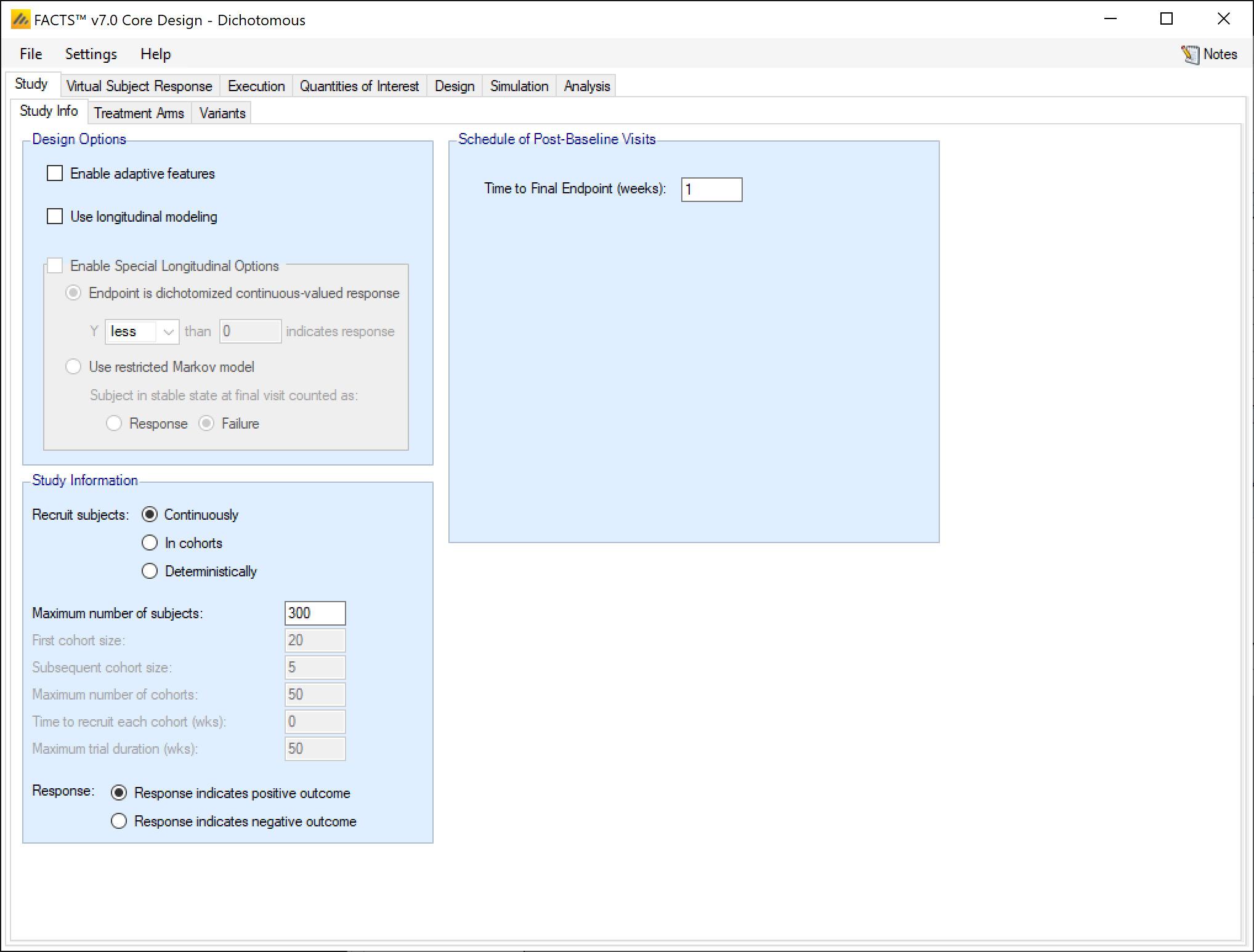 In the design options section of the Study tab the user gets check boxes for whether they want to enable adaptive features, use longitudinal modelling, or include simulation of baseline. These options have the following effects on the trial simulation.