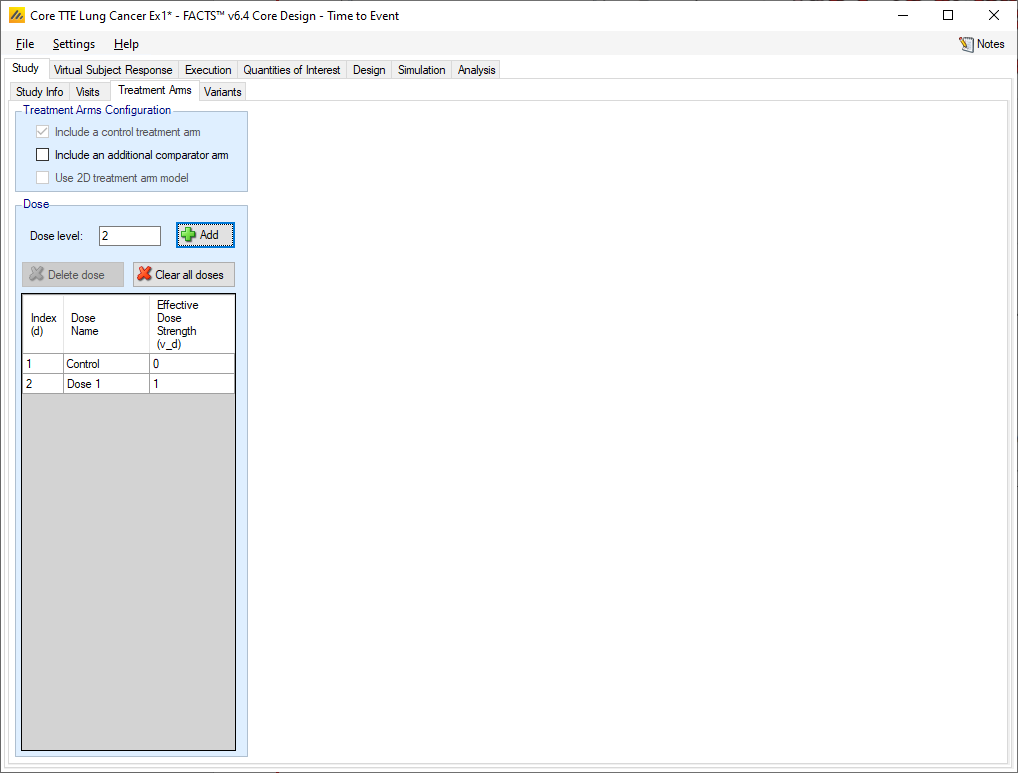 As with all FACTS Core engines, the Treatment Arms sub-tab provides an interface for specifying the various dose levels, Control and Additional Comparator arms. In time-to-event trials in FACTS the control arm must always be included and 2D dosing is not available.