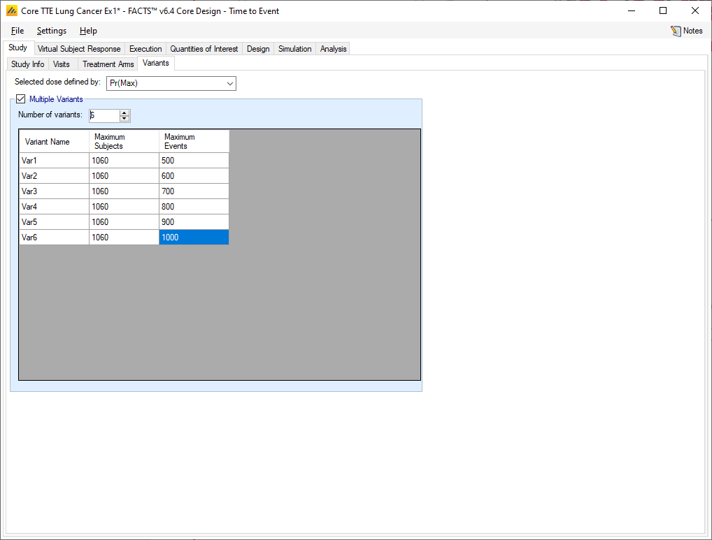 The user enters the number of variants they wish to create. Then in the resulting table, enter different “Maximum Subjects” and “Maximum Events” for each variant. On the simulations tab FACTS will then create a copy of all the scenarios to run with each variant.