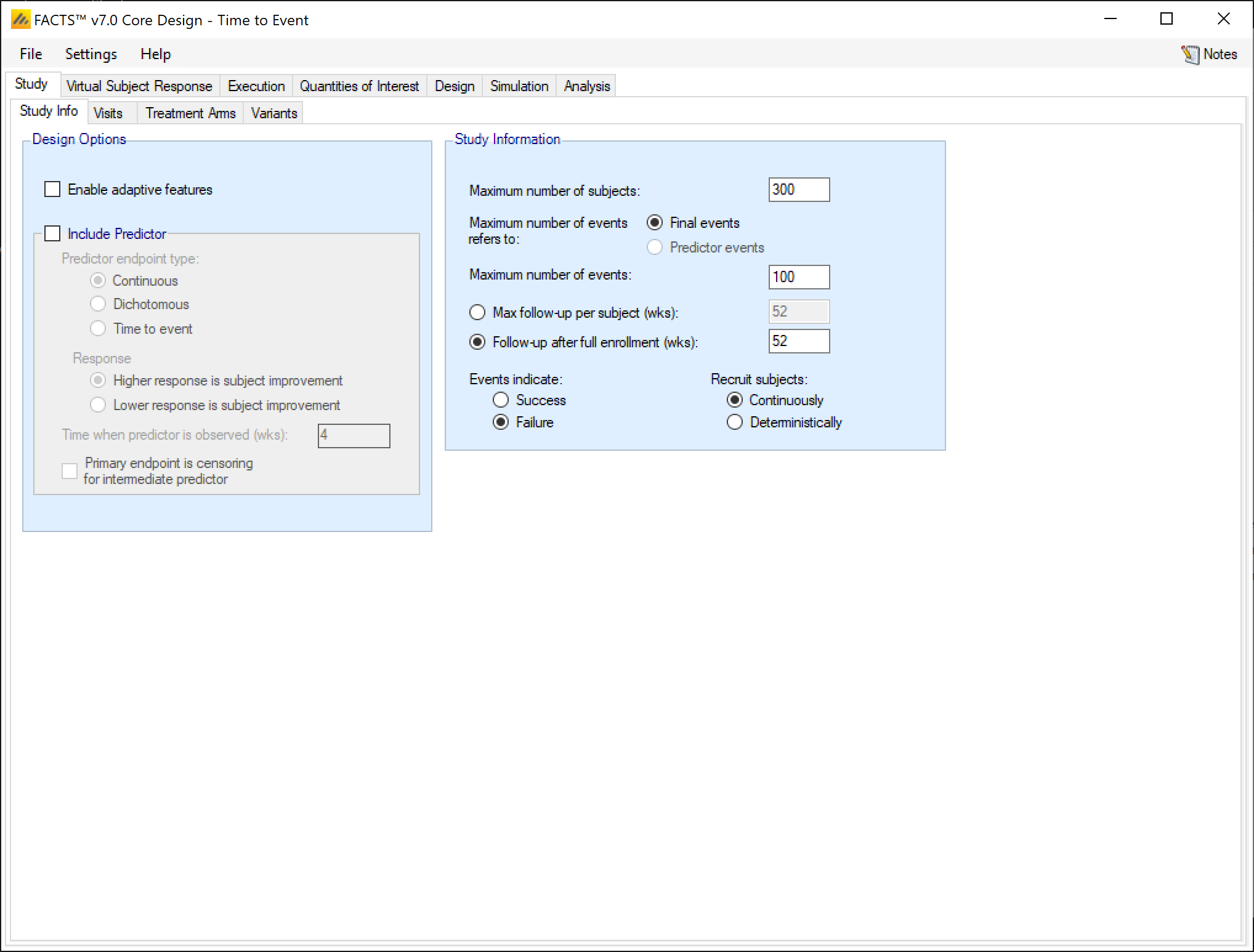 The Study Info sub-tab provides parameters for specifying rules and methods for common clinical trial simulation features. These include whether interim analyses will be simulated, if a predictor is used to impute subject event times, sample size, maximum number of events, follow-up times, and more.