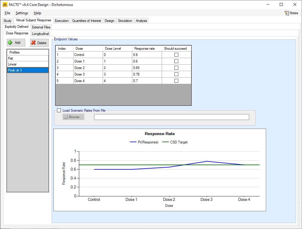 Explicitly defined VSRs are the most common type specified in FACTS. In dichotomous endpoint designs, an explicitly defined VSR is specified by providing a response rate for each arm in the trial. The dichotomous final outcome will be simulated having the desired response rate, and longitudinal correlation can be simulated connecting subjects’ intermediate endpoints to the final endpoint.