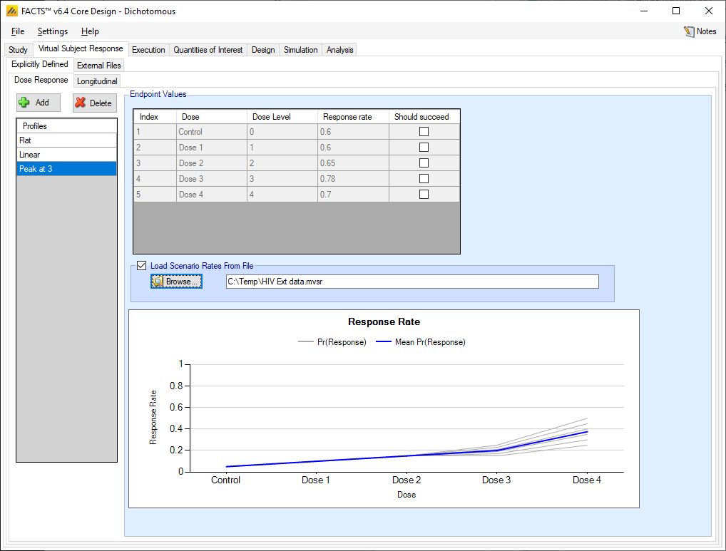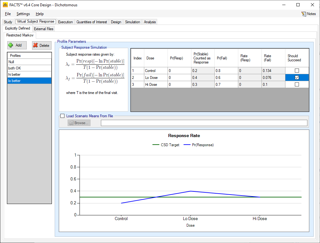If the “Load scenario means from a file” option is selected then in scenarios using this profile the simulations will use a range of dose responses. Each individual simulation uses one set of response rates from the supplied file, each row being used in an equal number of simulations. The summary results are thus averaged over all the VSRs in the file. The use of this form of simulation is somewhat different from simulations using a single rate or single external virtual subject response file. When all the simulations are simulated from one ‘truth’ then the purpose of the simulations is to analyse the performance of the design under that specific circumstance. When the simulations are based on a range of ‘truths’ then the summary results show the expected probability of the different outcomes for the trial over that range of possible circumstances. Note that to give different VSRs different weights of expectation, the more likely VSRs should be repeated within the file.