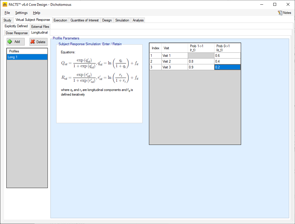 If no special longitudinal options are selected on the Study Info page, then this default simulation method that uses transition probabilities to simulate sequential dichotomous endpoints is used.