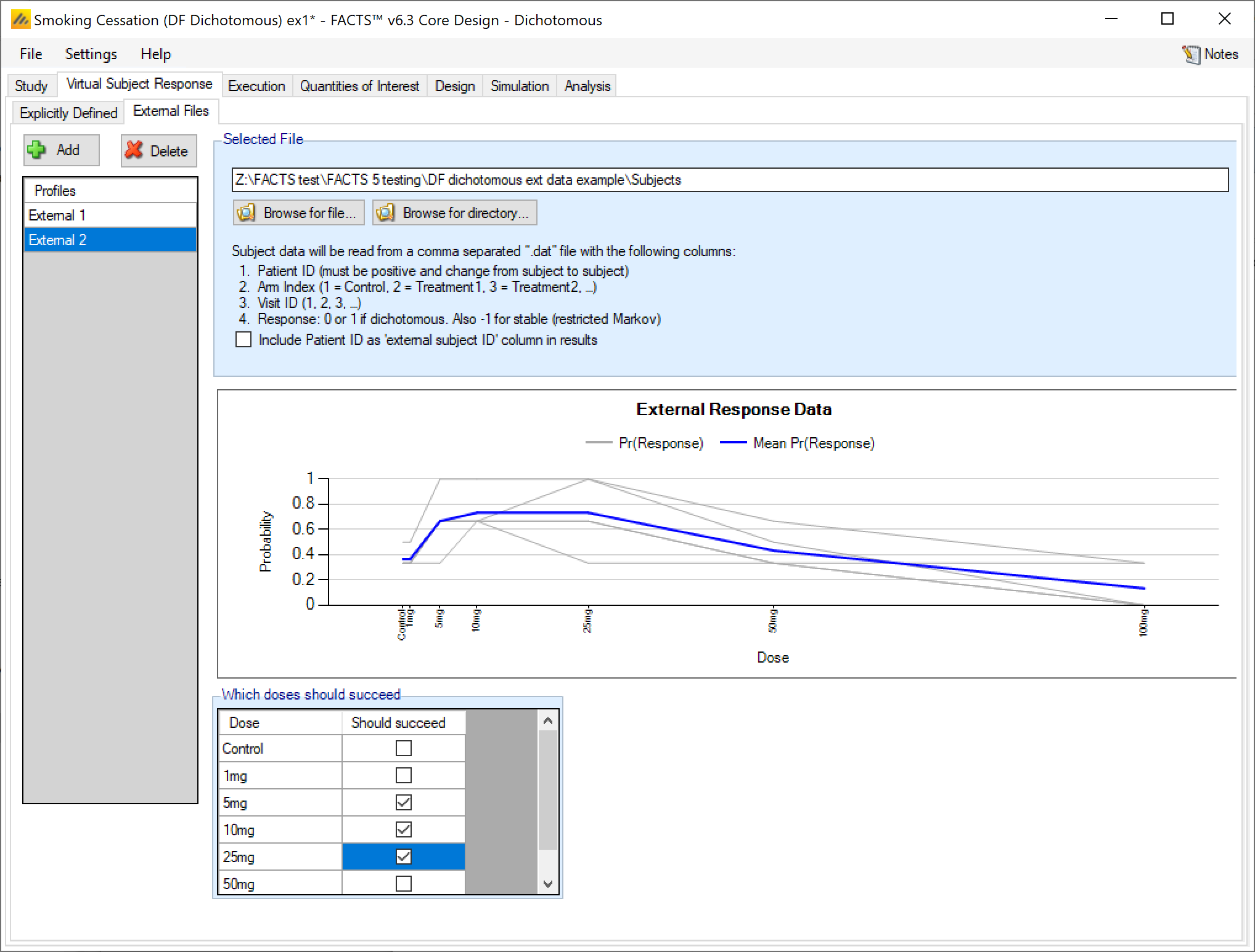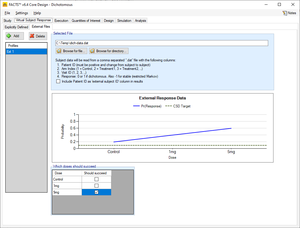As well as simulating subject responses within FACTS they can be simulated externally, and imported into FACTS where the supplied responses are sampled from with replacement when simulating the trial. The selection of a file containing subject response data (which must be in the required format) can be done from the External Files sub-tab depicted below. The External Files option is available if specifying the dichotomous endpoint as restricted Markov, dichotomized continuous, or without special longitudinal options.