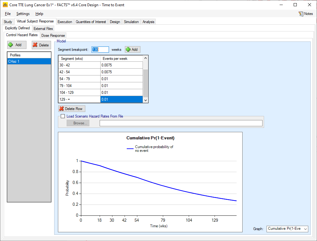 The hazard rate to simulate in a profile is specified as a piecewise exponential. The follow-up time can be divided into different time segments and a different event rate simulated in each segment.