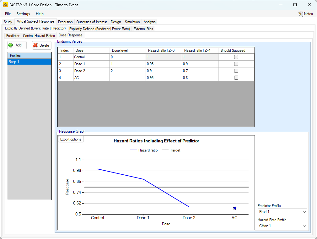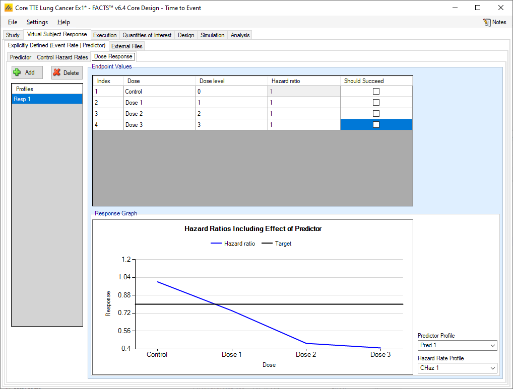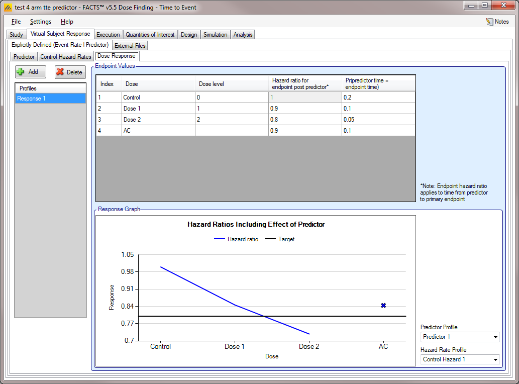 As usual, multiple dose response profiles can be created, and in each profile the hazard ratio to simulate for each treatment arm compared to the control arm is specified. What differs from the case where there is no predictor, is that, if a dichotomous predictor is being used, separate hazard ratios are specified for subjects depending on whether or not they will have the dichotomous predictor response or not.