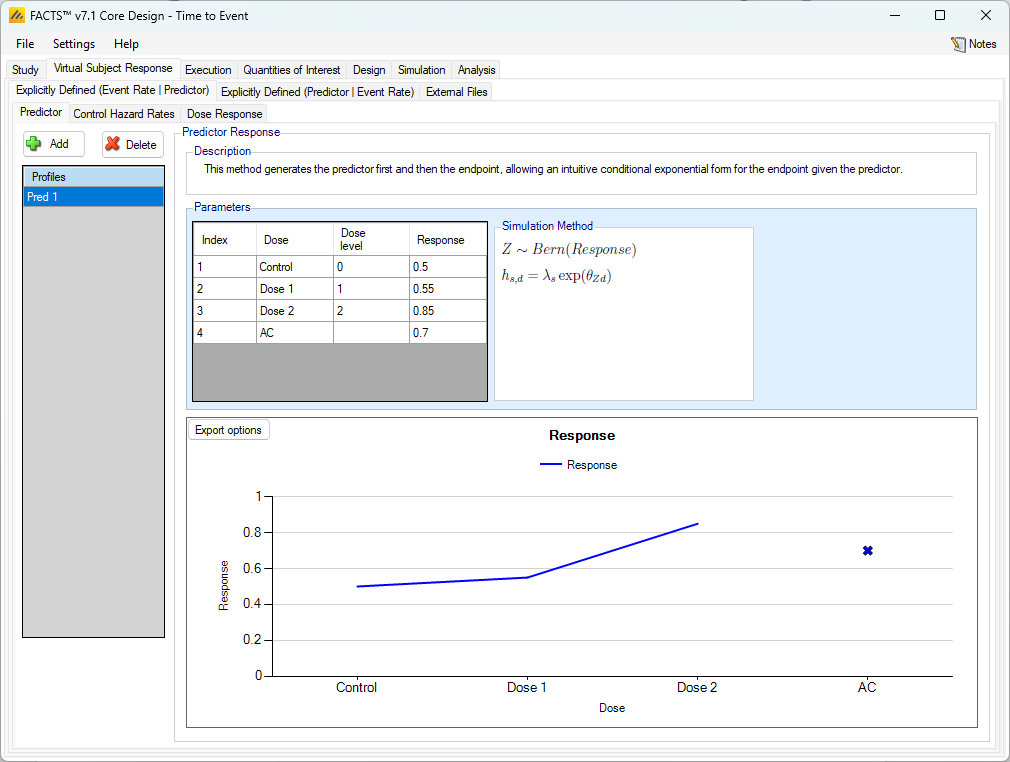 The user may create a number of different dose response profiles to simulate from. The different profiles will be used to define different simulation scenarios in combination with other profiles defining the other properties that have to be simulated.