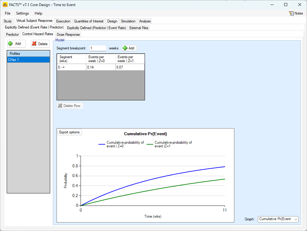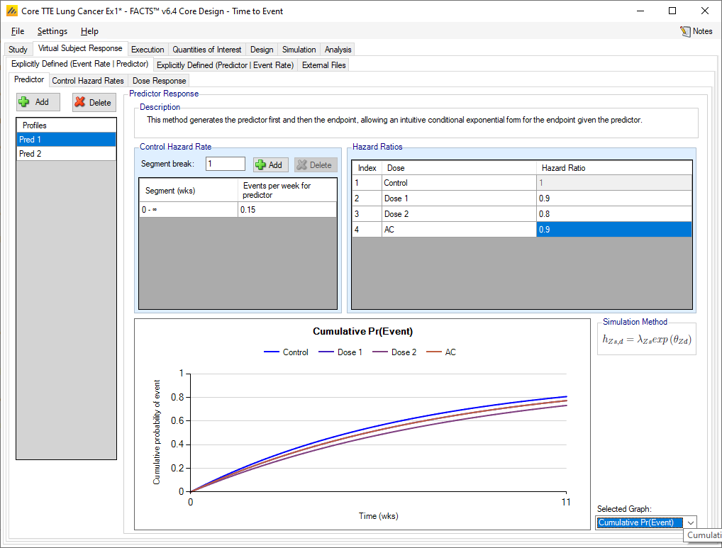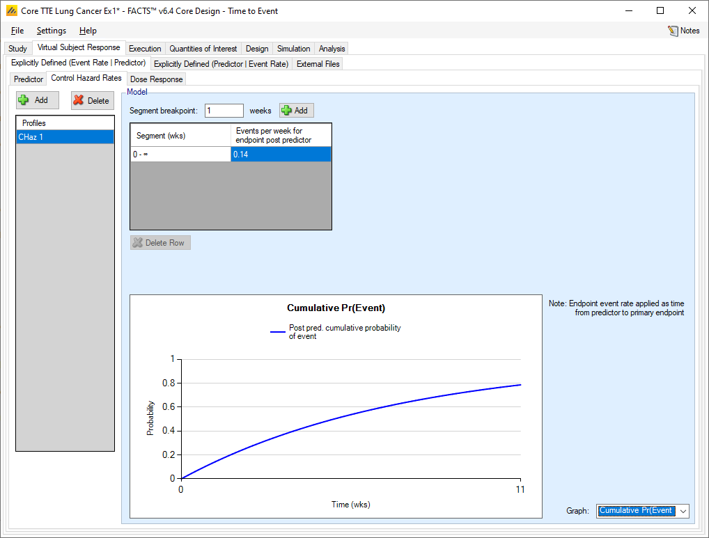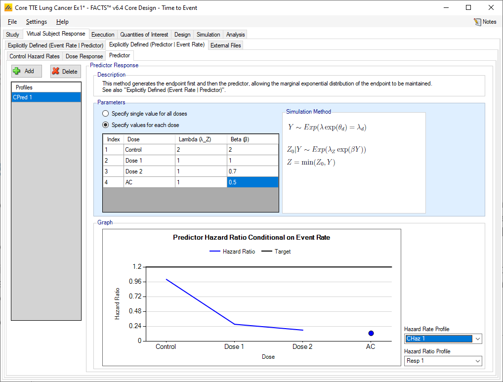 The “Explicitly Defined (Predictor | Event Rate)” tab allows the specification of profiles that define how the predictor endpoint is to be simulated in relation to the control hazard rate and hazard ratios for the final events. This allows the simulated final observed final events to still have an exponential distribution.