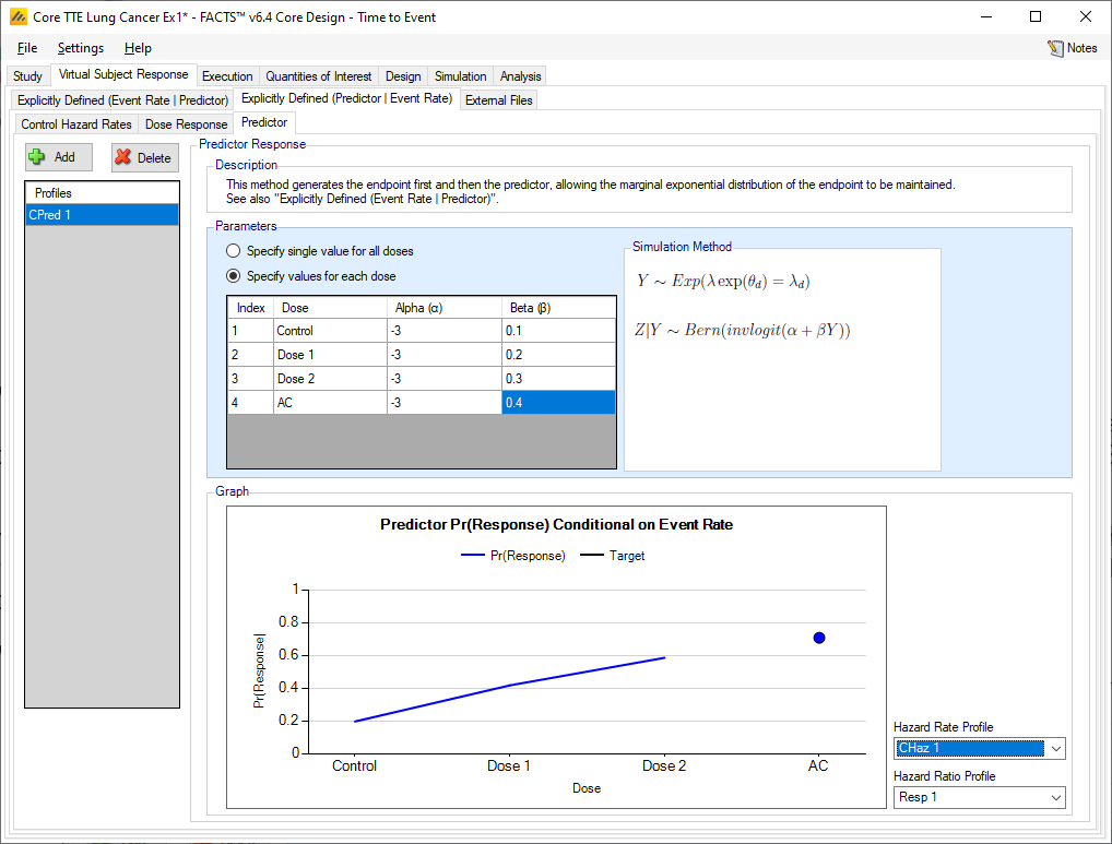 The manner of specifying the dose response does not change – multiple profiles may be specified and in each profile the hazard ratio for each treatment arm is specified. However, the overall hazard ratio simulated will depend on the combination of the control hazard rate, the dose response hazard ratio and the effect of the predictor on the final event rate.