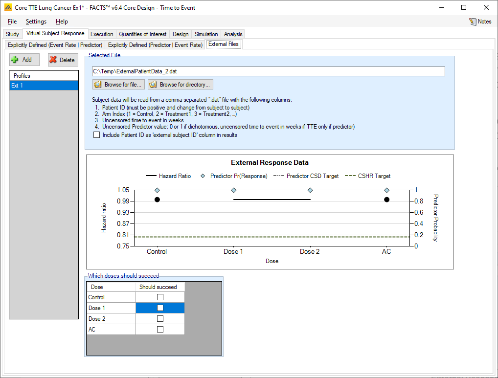 As well as simulating subject responses within FACTS they can be simulated externally and imported into FACTS where the supplied responses are sampled from when simulating the trial. The specification of a file containing subject response data can be done from the External Files sub-tab depicted in Figure 5 below.