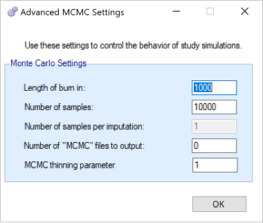 The MCMC file, if requested for output by the user, contains all the MCMC samples for the fitted parameters in the design. There is one row per sample (excluding the burnin) and the samples from all the analyses (i.e from every cohort – or if using open enrollment, every subject) in the simulation are included. The first two columns are the cohort’s index and the sample (within analysis) index. The remaining columns are the parameters whose sample values are being reported, the number and constituents of these columns are highly variable depending on design of the statistical analysis.