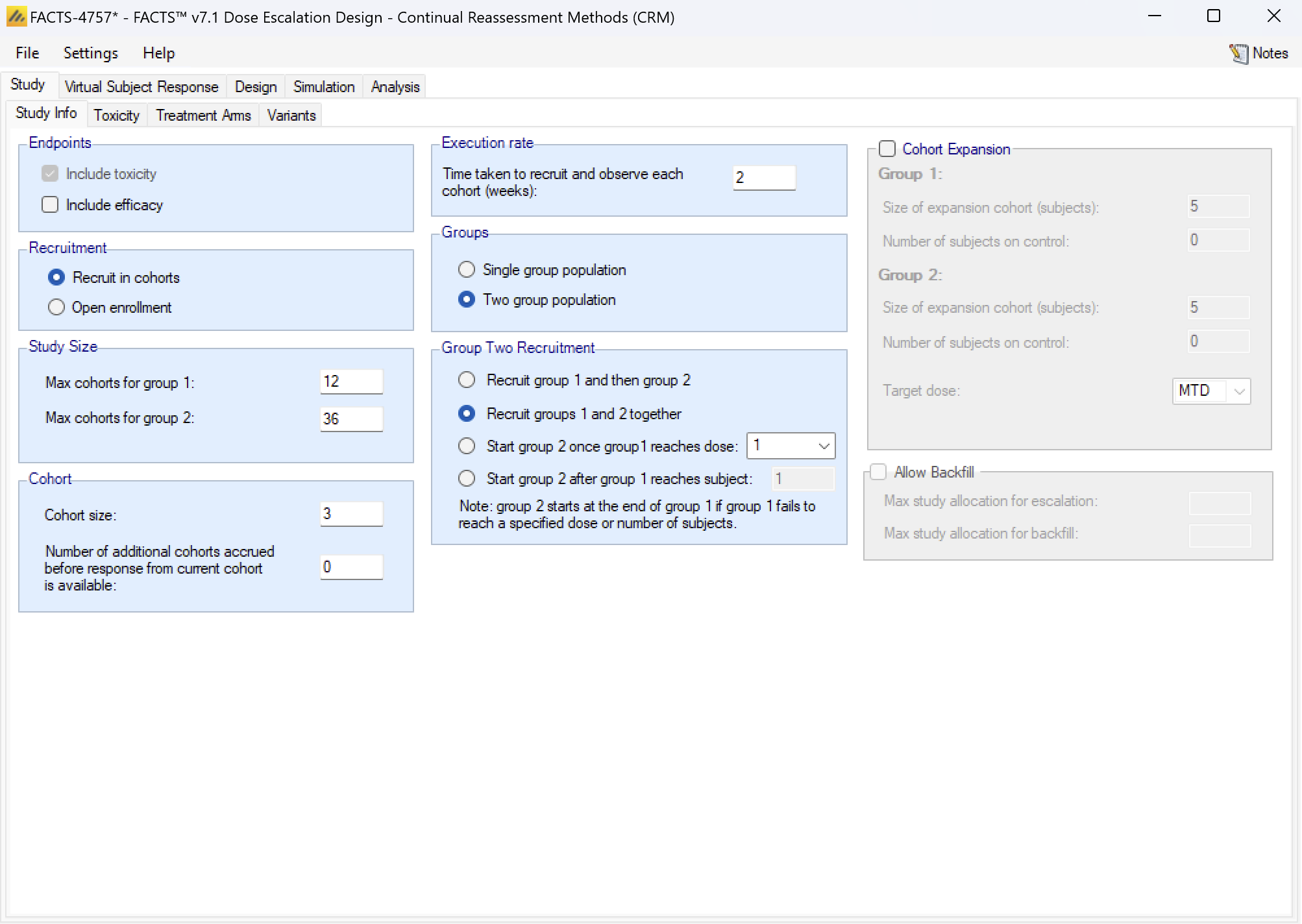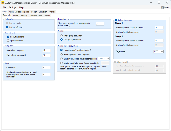 - Designs which include efficacy, the “Maximum cohorts used to determine MTD” parameter on the Allocation Rule tab is now observed, in FACTS 6.4 and earlier it was ignored.