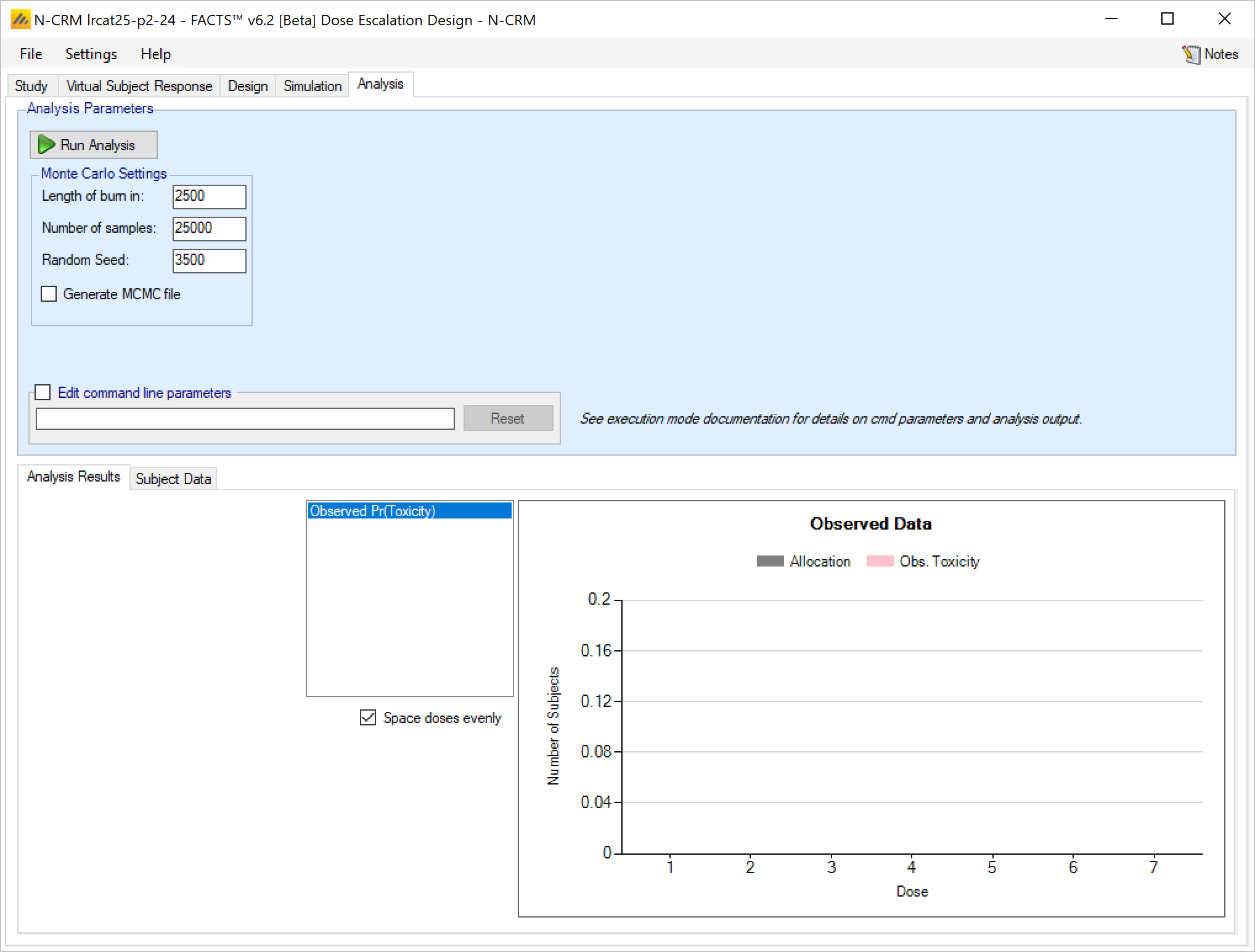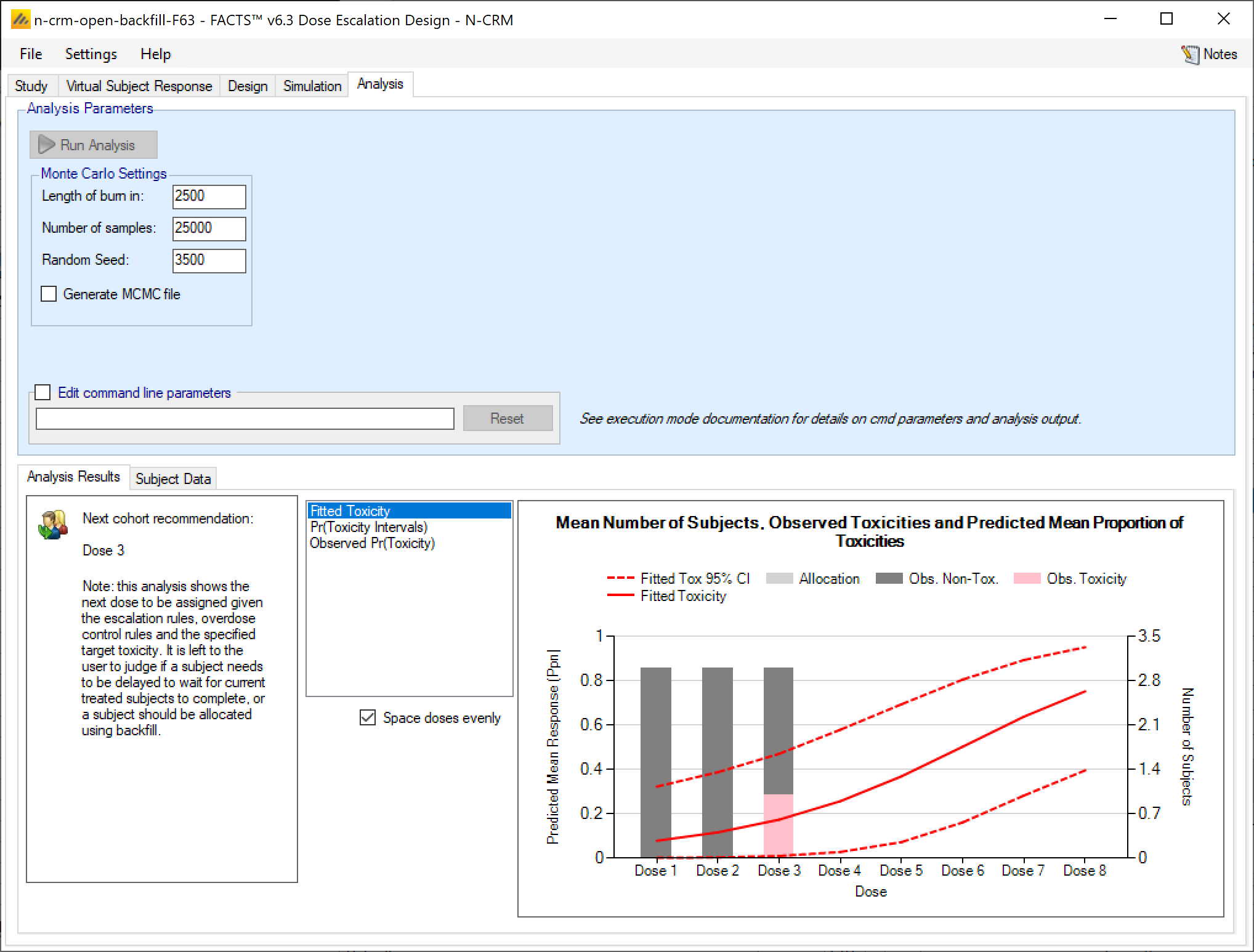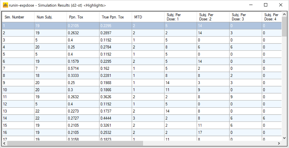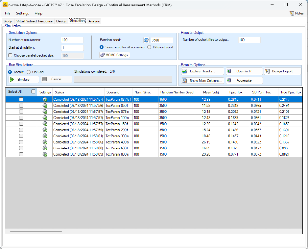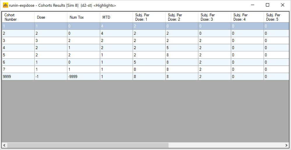 Once all the subjects in a cohort have completed, FACTS updates its analysis of the dose toxicity, re-evaluates the dose-escalation rules and selects the dose the next cohort will be allocated to. As well as the final results of each simulated trial, each time a cohort completes FACTS outputs the data available and the results of the analysis. These are referred to as “cohorts files”, and when you run the simulations, you can specify for how many of them you want these additional files written out.