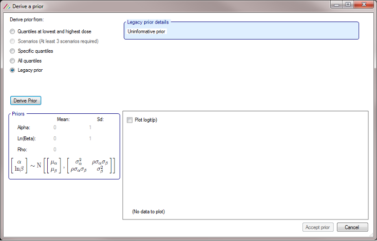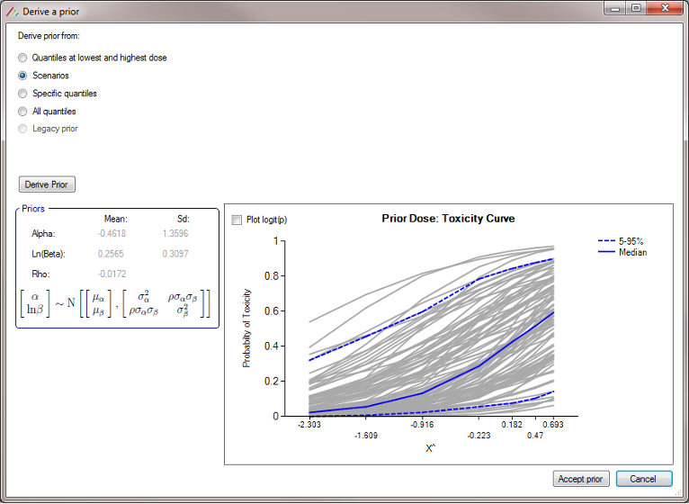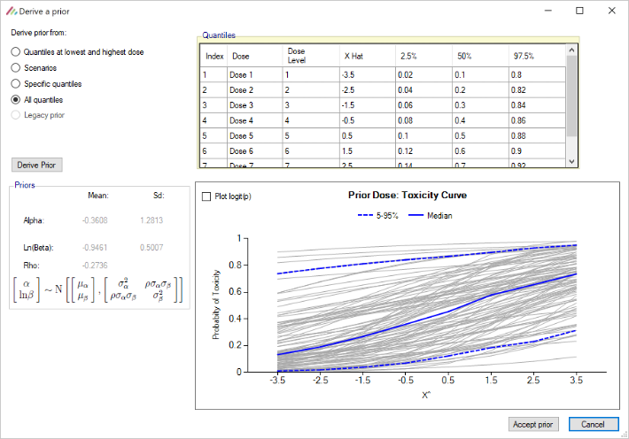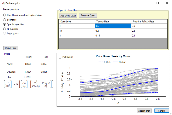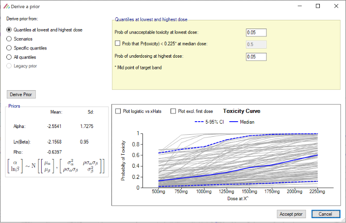 - When deriving toxicity/efficacy priors from specific quantiles the specification of at least two dose levels is now required whereas previously the specification of at least three dose levels was required.