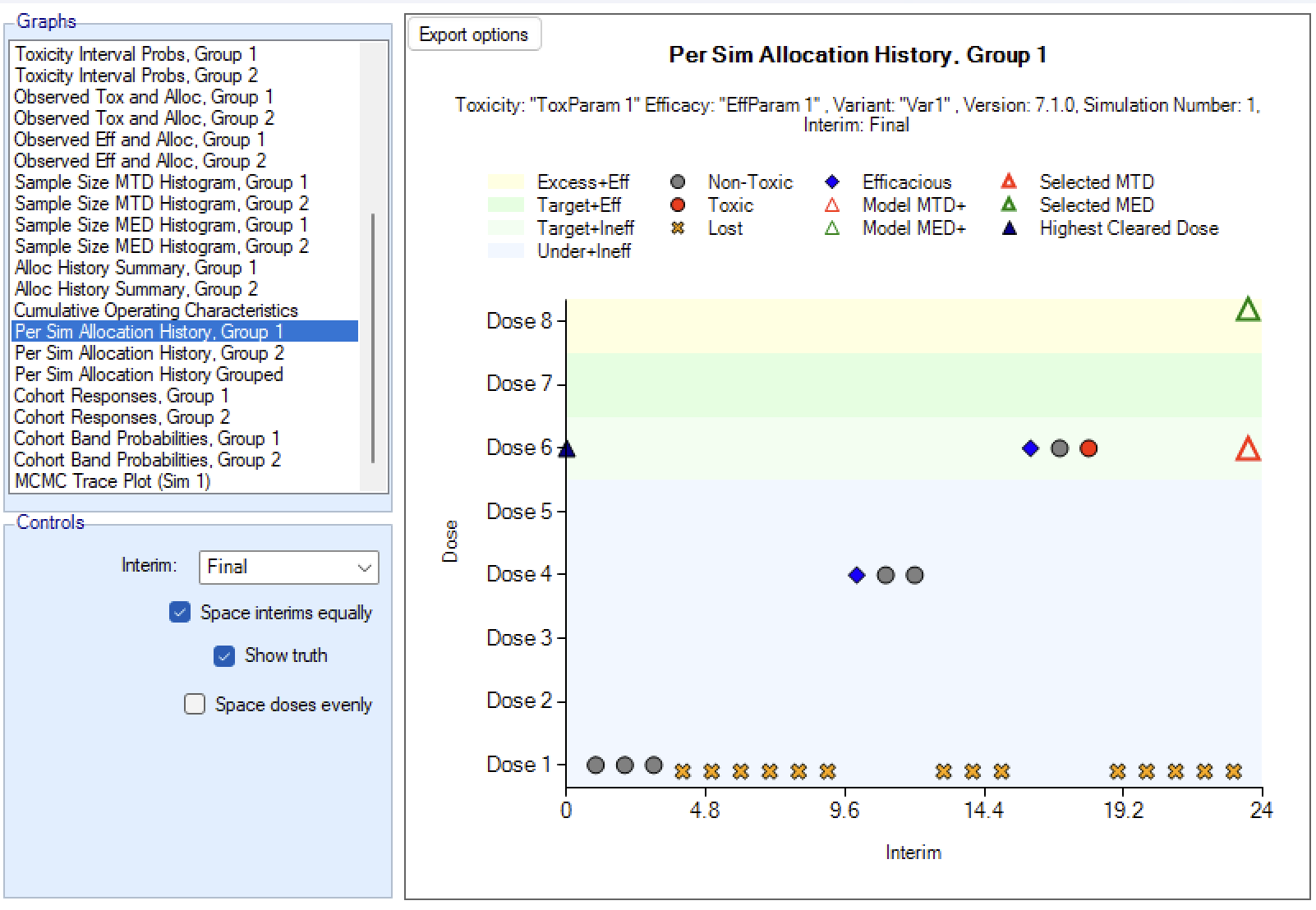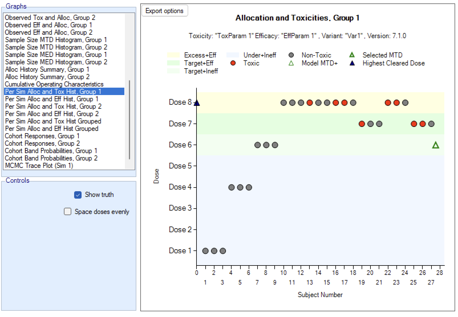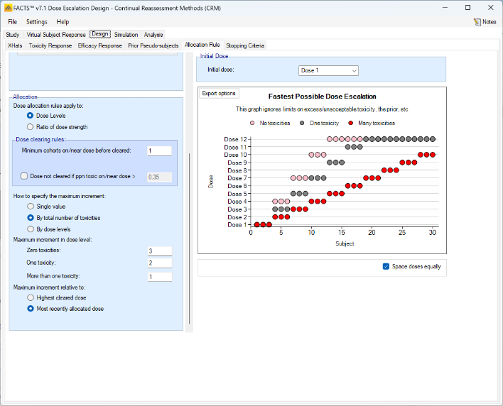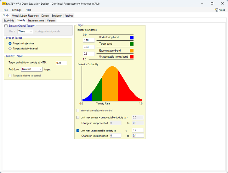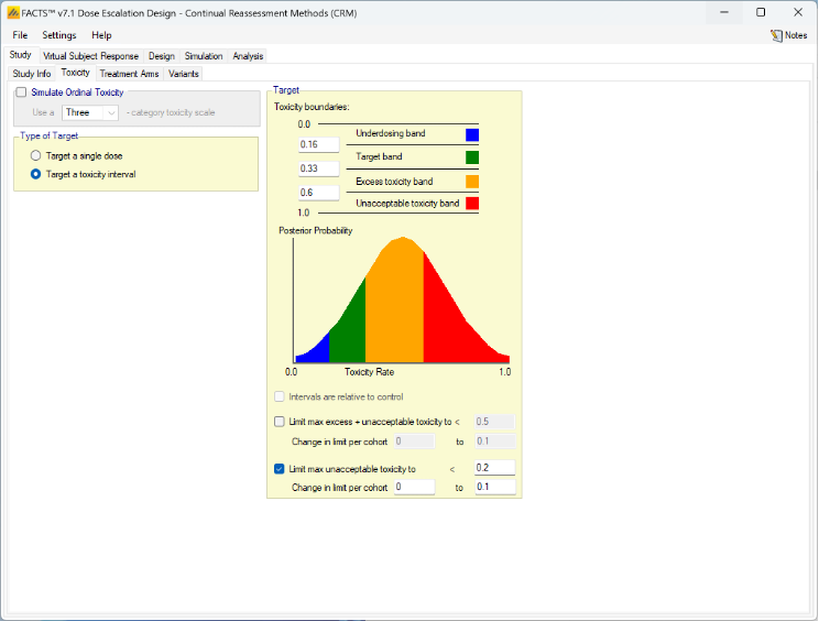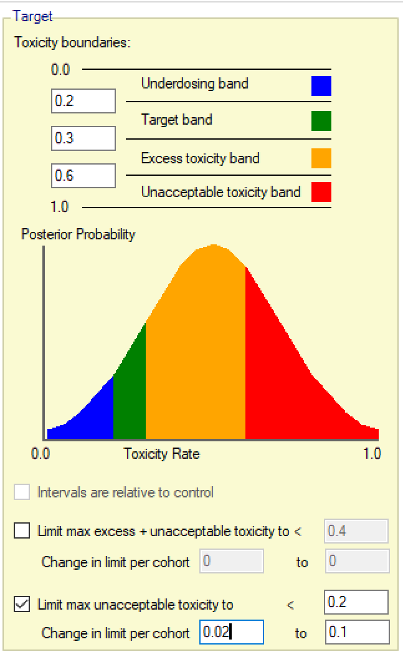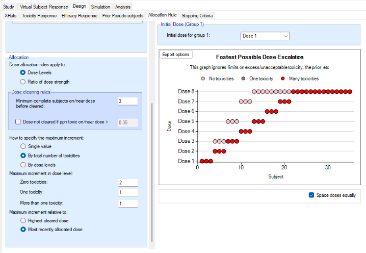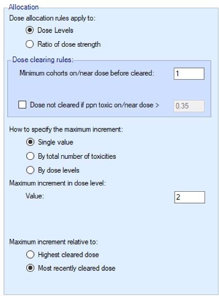 - Overdose control: a limit can be specified on the probability that a dose’s toxicity rate is above a certain level, and any dose for which this is true is excluded from allocation. (Specified on the Study > Toxicity tab)