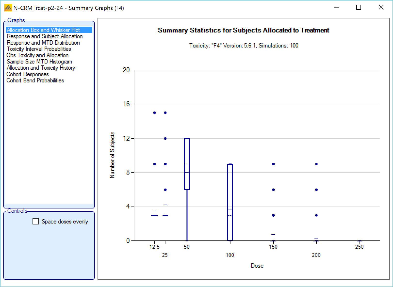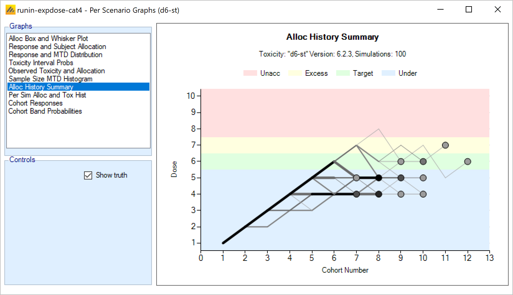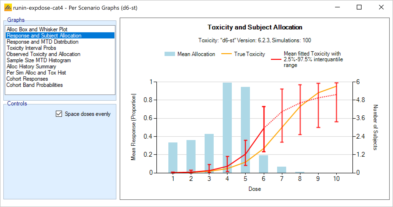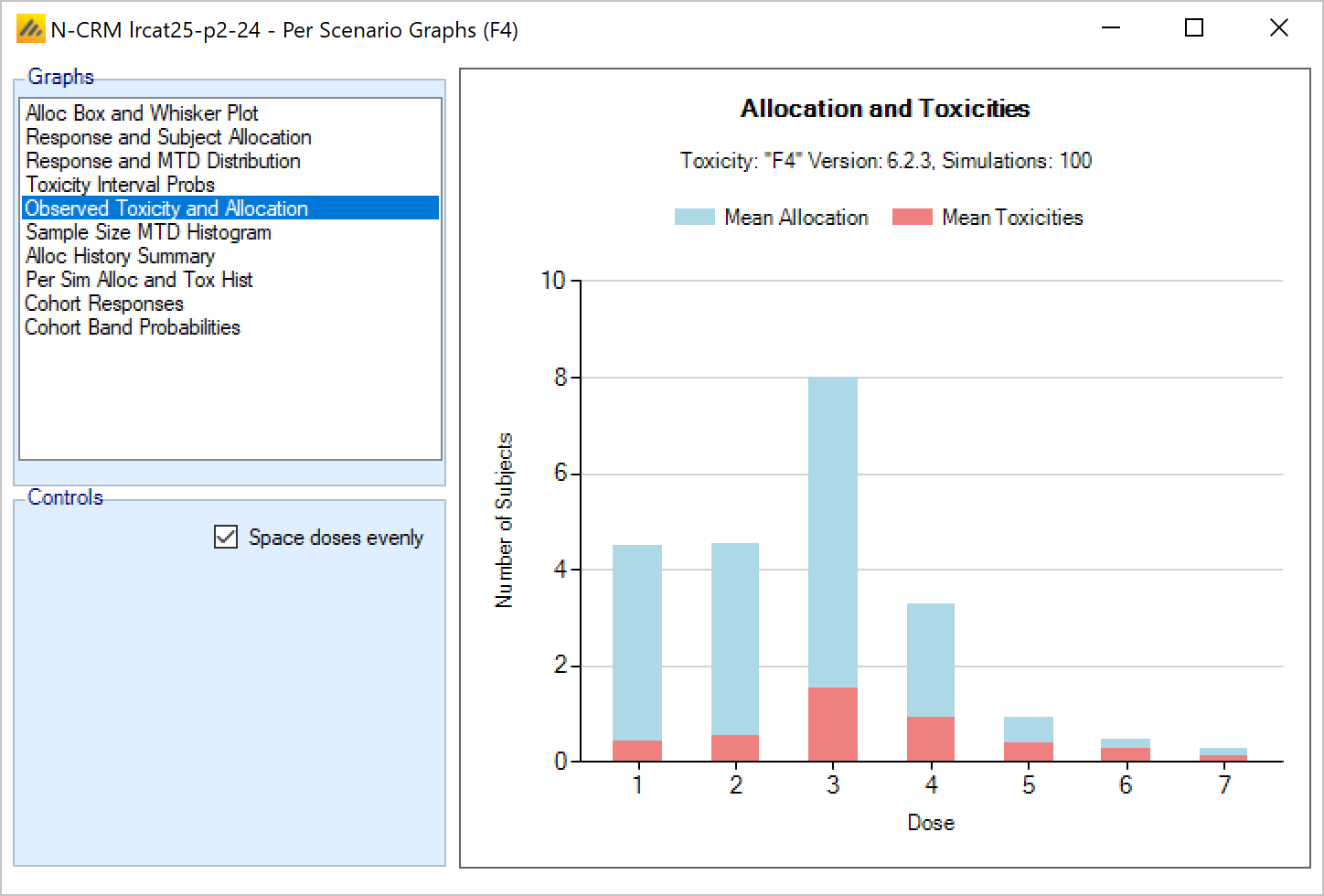 - Overdose control: a limit can be specified on the probability that a dose’s toxicity rate is above a certain level, and any dose for which this is true is excluded from allocation. (Specified on the Study > Toxicity tab)