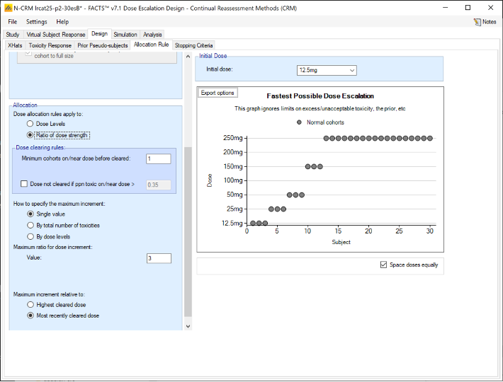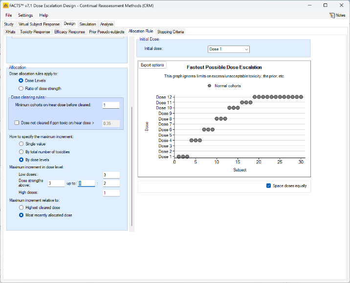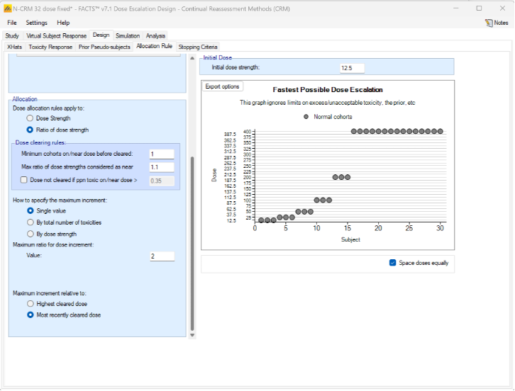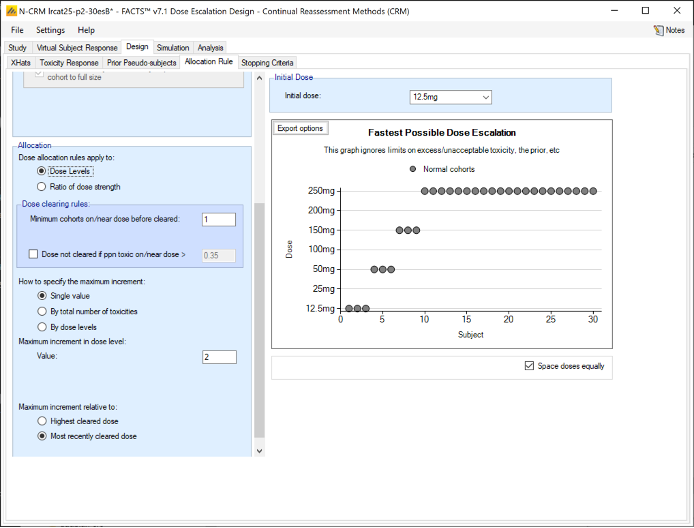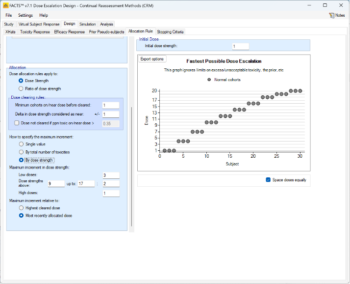 - Dose escalation rules: The size of the increase in dose strength from one cohort to the next can be specified (Specified on the Design > Allocation Rule tab).