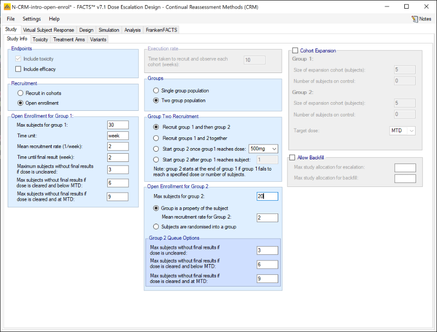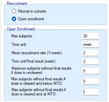 In an N-CRM dose escalation trial, subjects are exposed to the novel treatment at increasing dose strengths, not progressing to the next dose strength until lower doses have been shown to be sufficiently safe, and not progressing beyond the dose which appears to display the maximum tolerated rate of toxicity, or the target rate of toxicity, the “Maximum Tolerated Dose” (MTD). To limit the risk of exposing subjects to a new, higher dose strength, subjects are allocated in “cohorts’ of a given size and no further subjects are recruited until all the subjects in the cohort complete treatment and follow-up. To enroll subjects quicker and introduce further options to manage the risk of exposure at new doses, FACTS allows “Open Enrolment” of new subjects, which is a form of design that dispenses with cohorts and is described in this section.