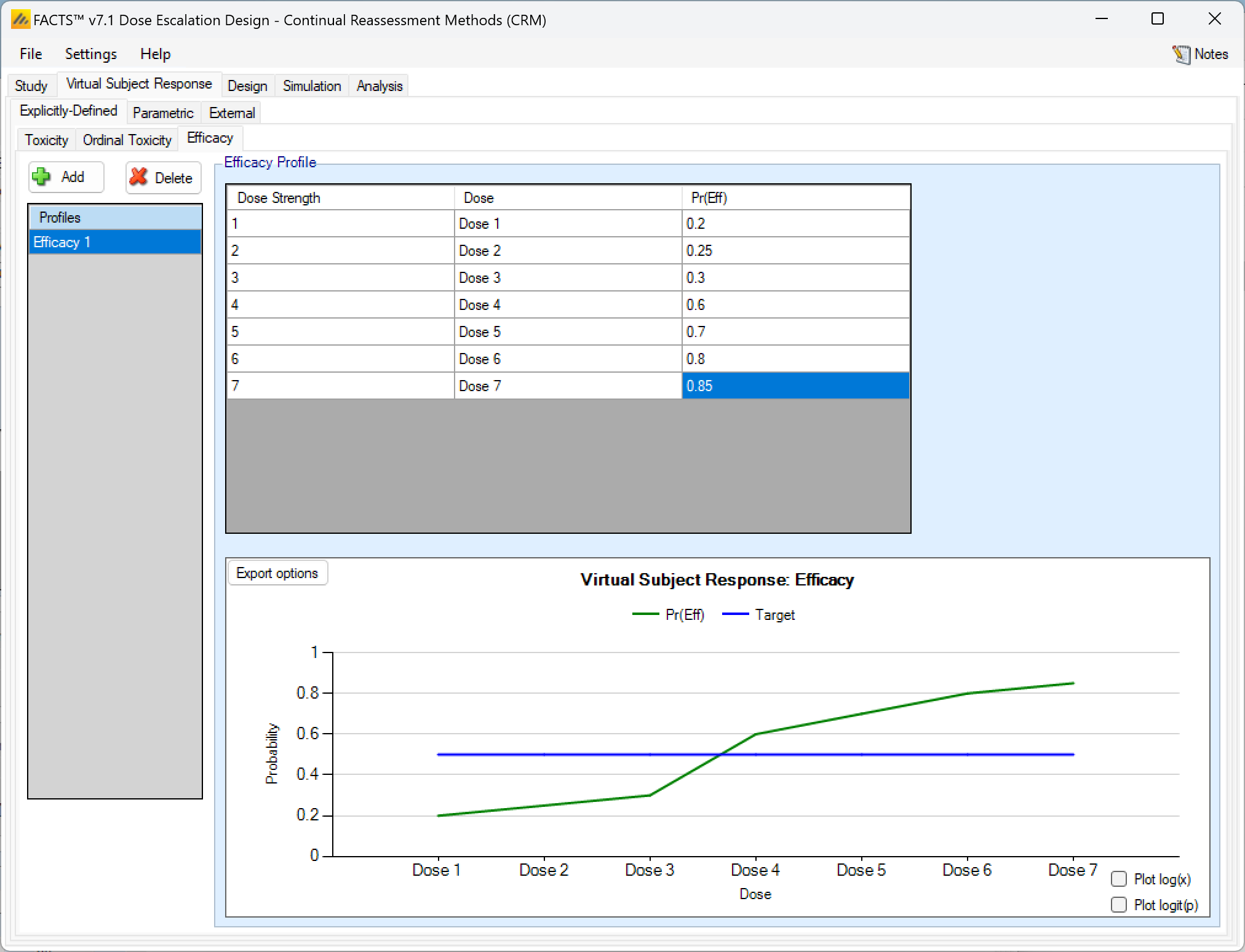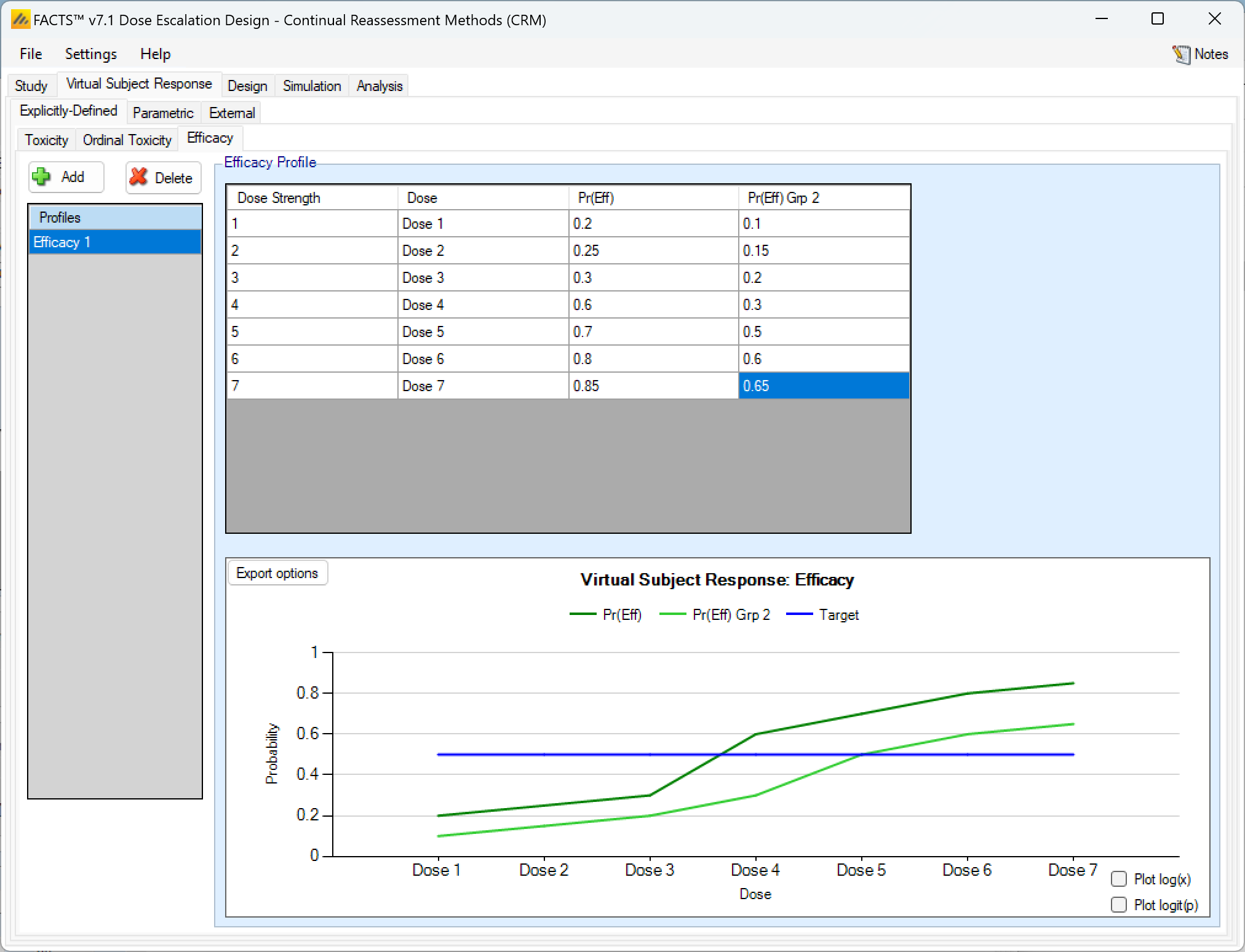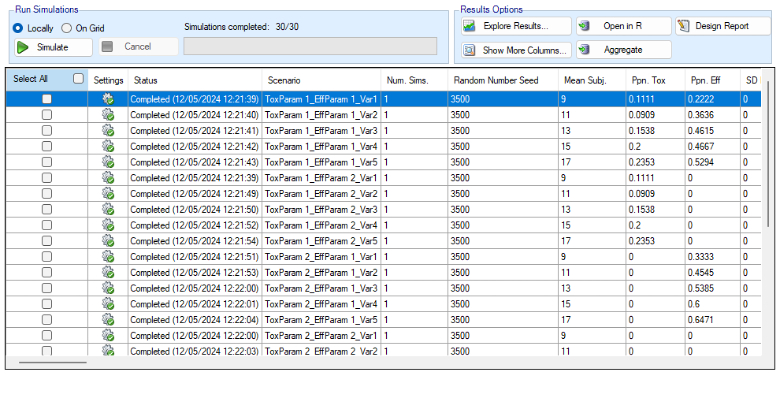 | True Efficacy <Dose> | One per dose – Efficacy only | The efficacy rate being simulated for that dose in the scenario. |