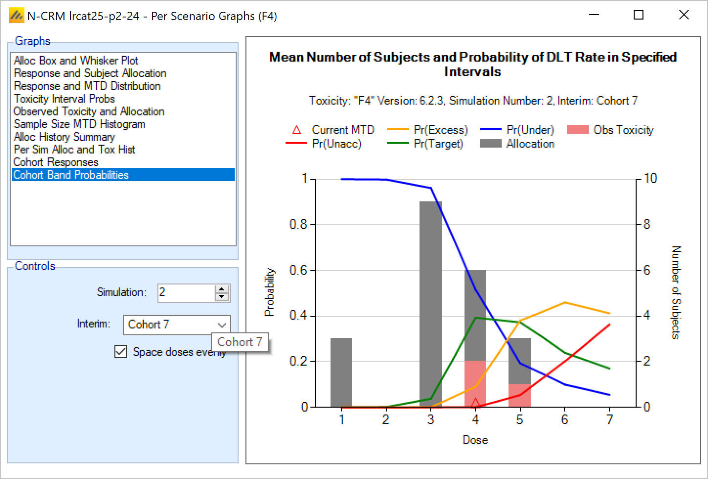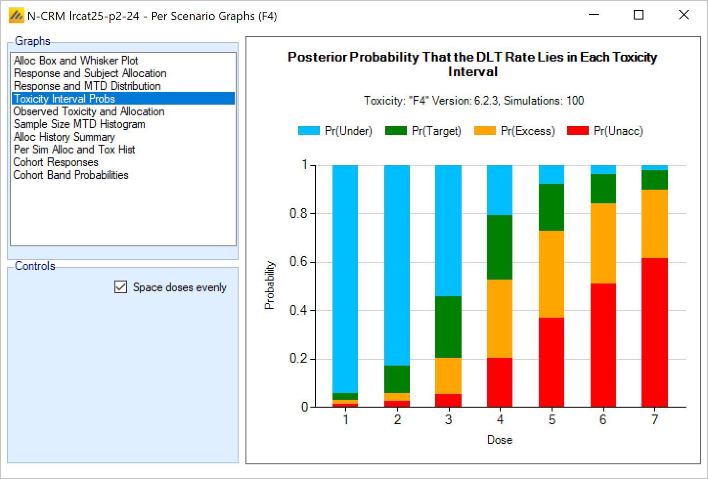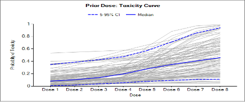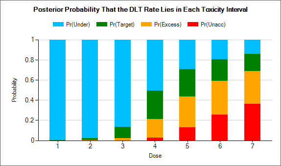 | Pr(Unacc) Tox <dose index> | One per dose | The posterior probability for each dose that its toxicity rate is in the ‘Unacceptable’ toxicity band. |
