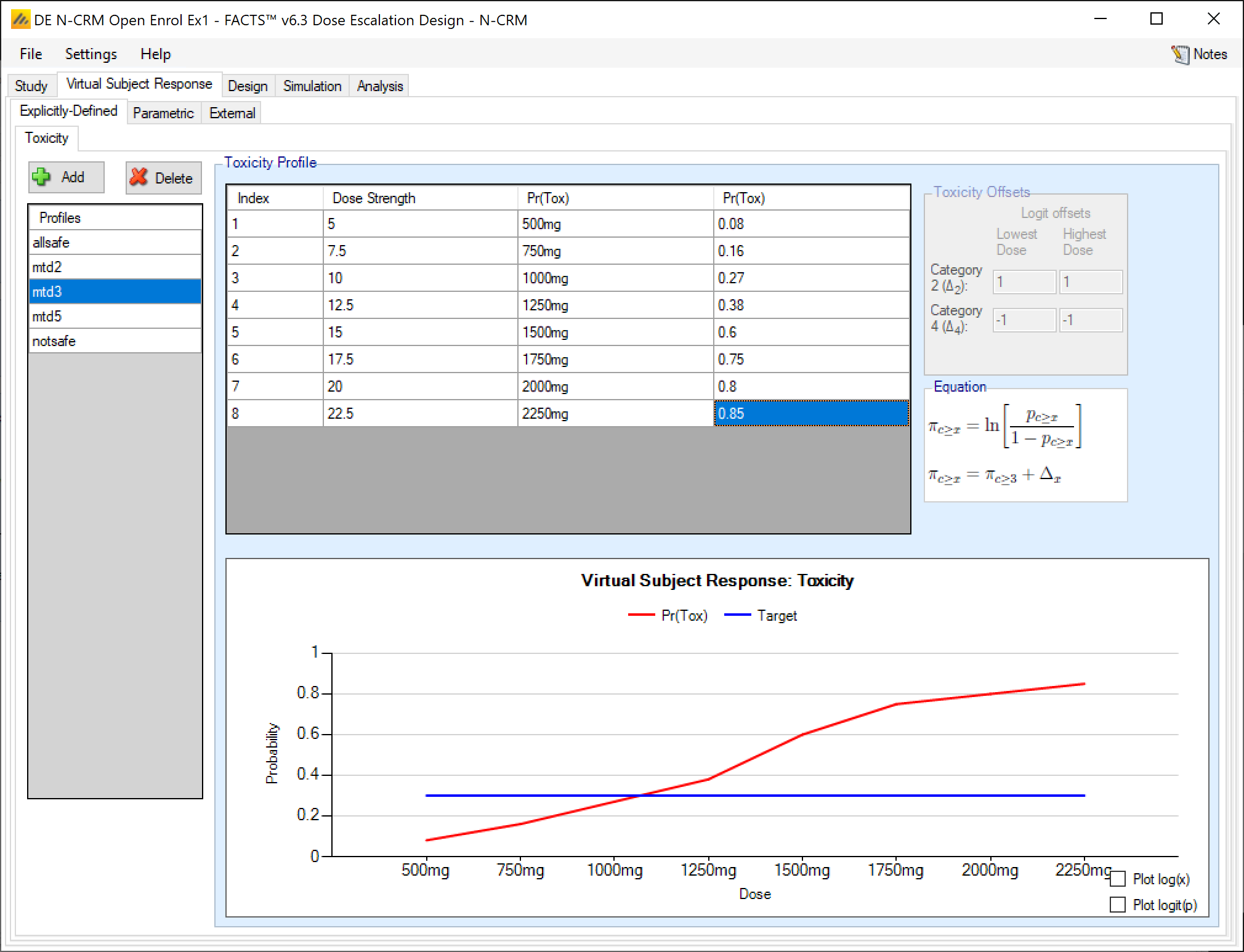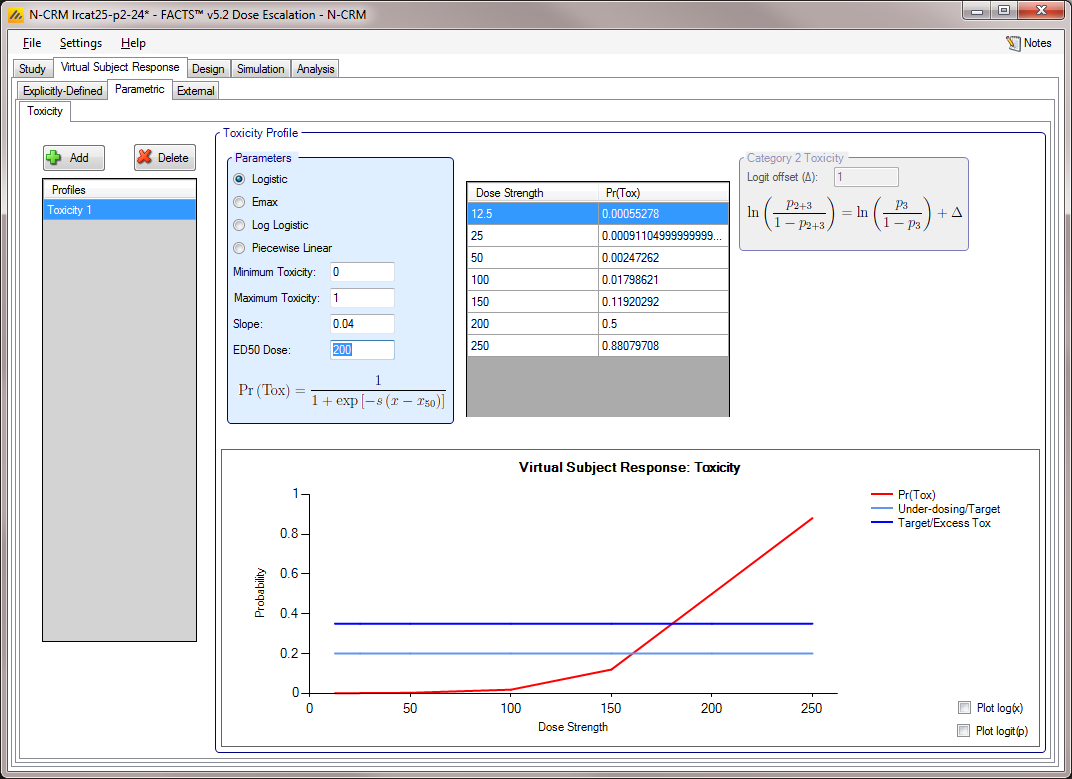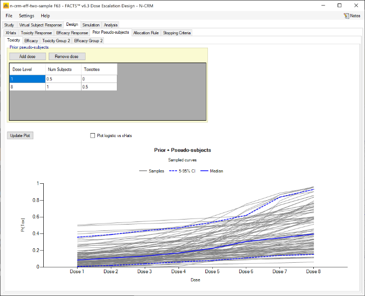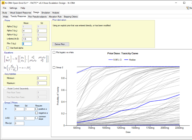 In FACTS 6.2 features available separately in the other FACTS CRM engines (CRM (Toxicity), bCRM & CRM Ordinal) were all incorporated into N-CRM. This allowed these features to be used in conjunction with N-CRM’s target toxicity band methodology, overdose control and open enrollment features, as well as in conjunction with each other for the first time.