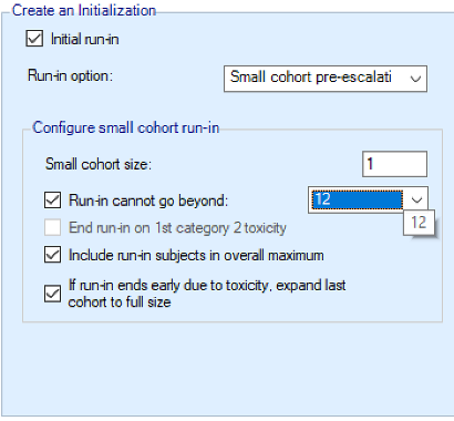 - Specifying a maximum dose at which the run-in stops if no toxicities are observed until that dose.