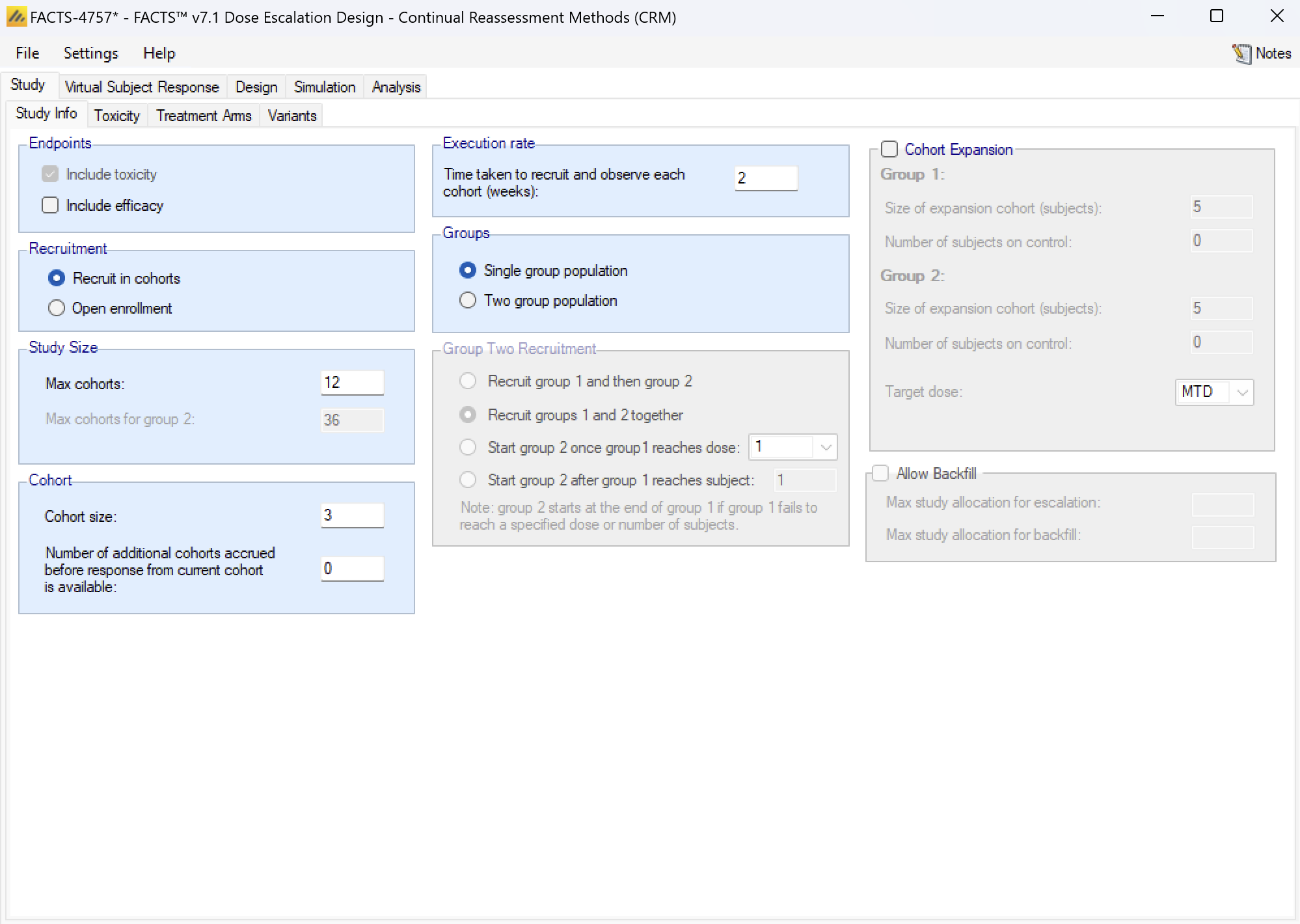 - Under the ‘Study’ tab the user can now specify the number of design variants, and for each variant the maximum study size in Cohorts.