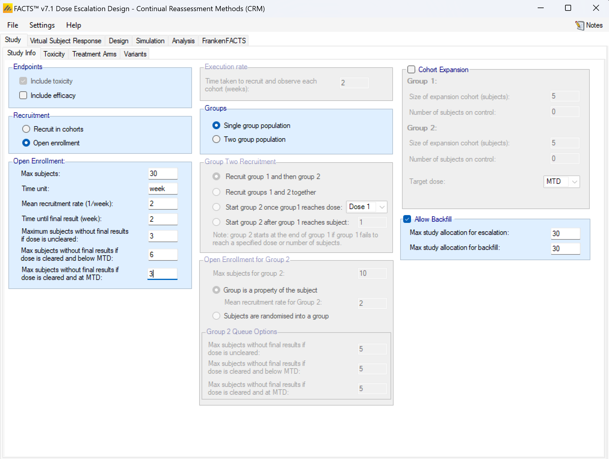 - New “backfill” options in open enrolment. Backfill allows subjects that become available at a time when they can’t be allocated to the current dose (because the maximum number of subjects without final results have already been allocated to the current dose).