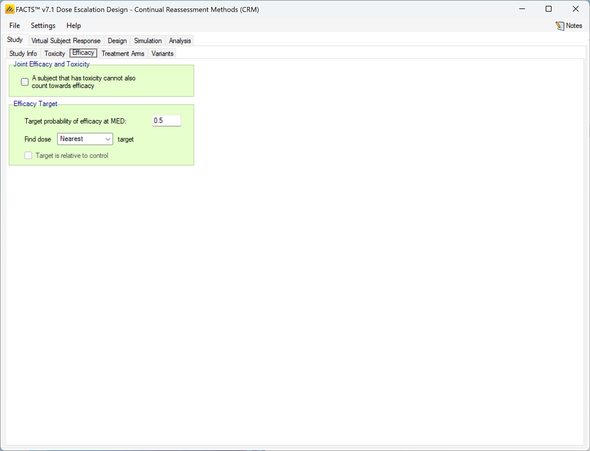 - When deriving toxicity/efficacy priors from quantiles at the lowest and highest doses, the “middle” probability option now refers to the median dose rather than the reference dose and is now optional. When pre-6.5 FACTS files are loaded in FACTS 6.5, the “middle” probability option will be ignored and replaced by 0.5.