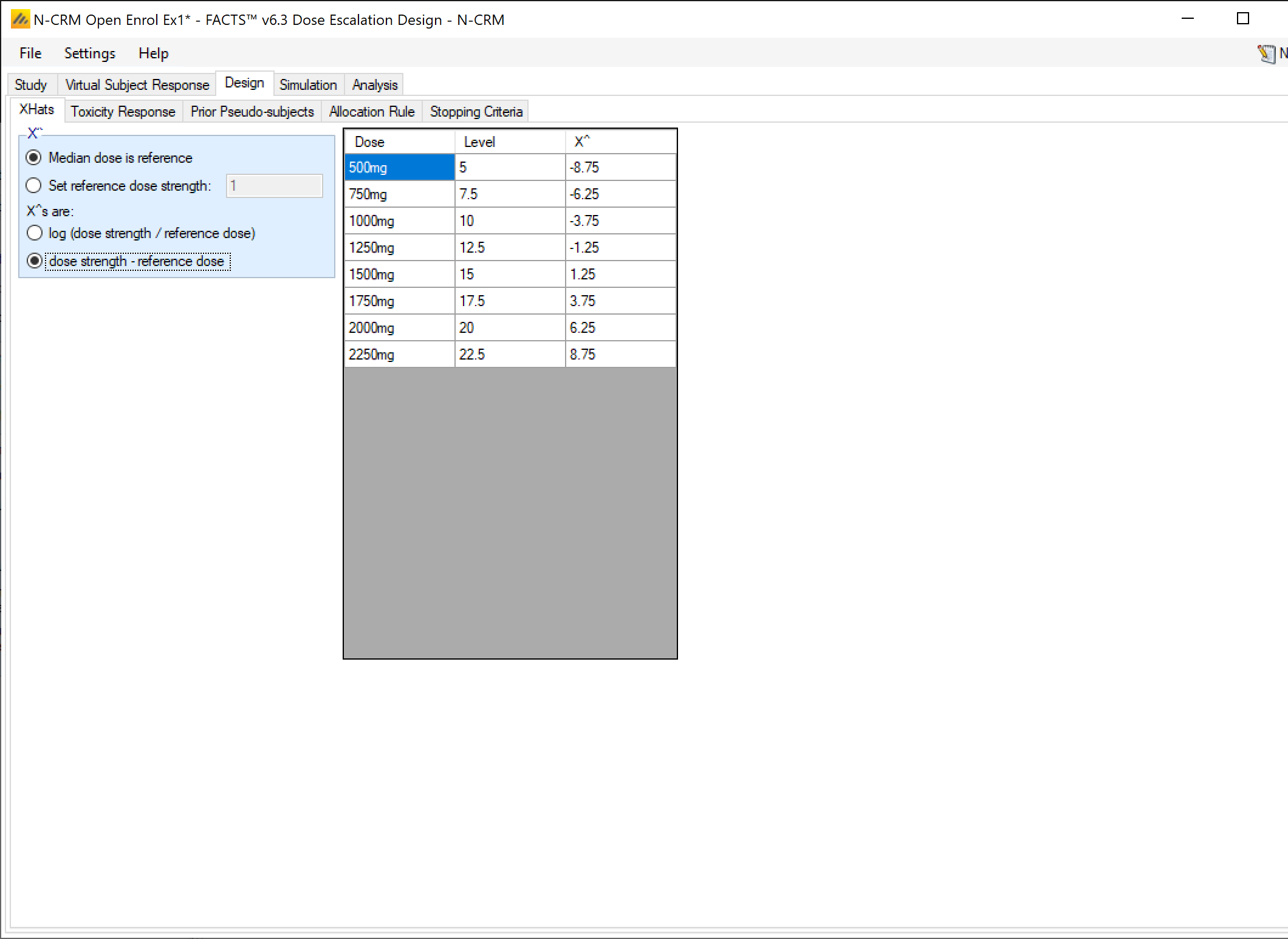- Starting dose: the dose strength to be allocated to the first cohort. (Specified on the Design > Allocation Rule tab)