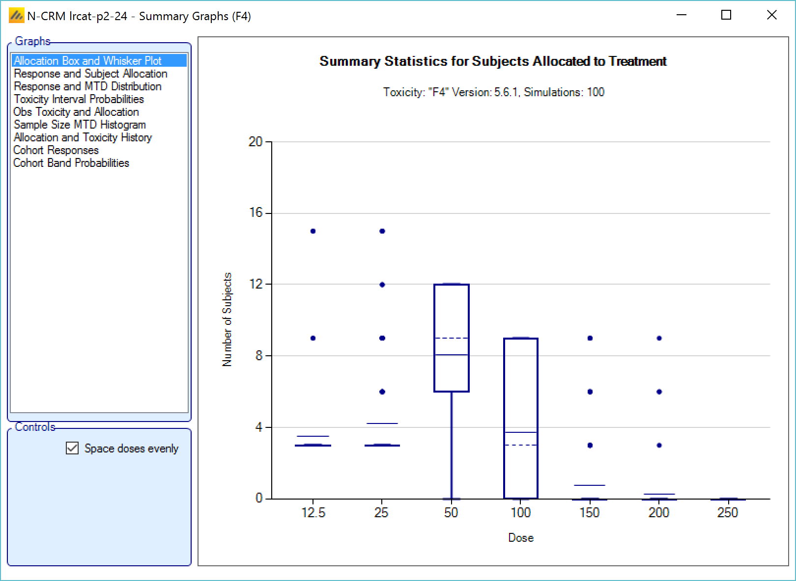 - Custom: allocates a defined number of subjects (possibly varying by dose) to selected doses in ascending order.