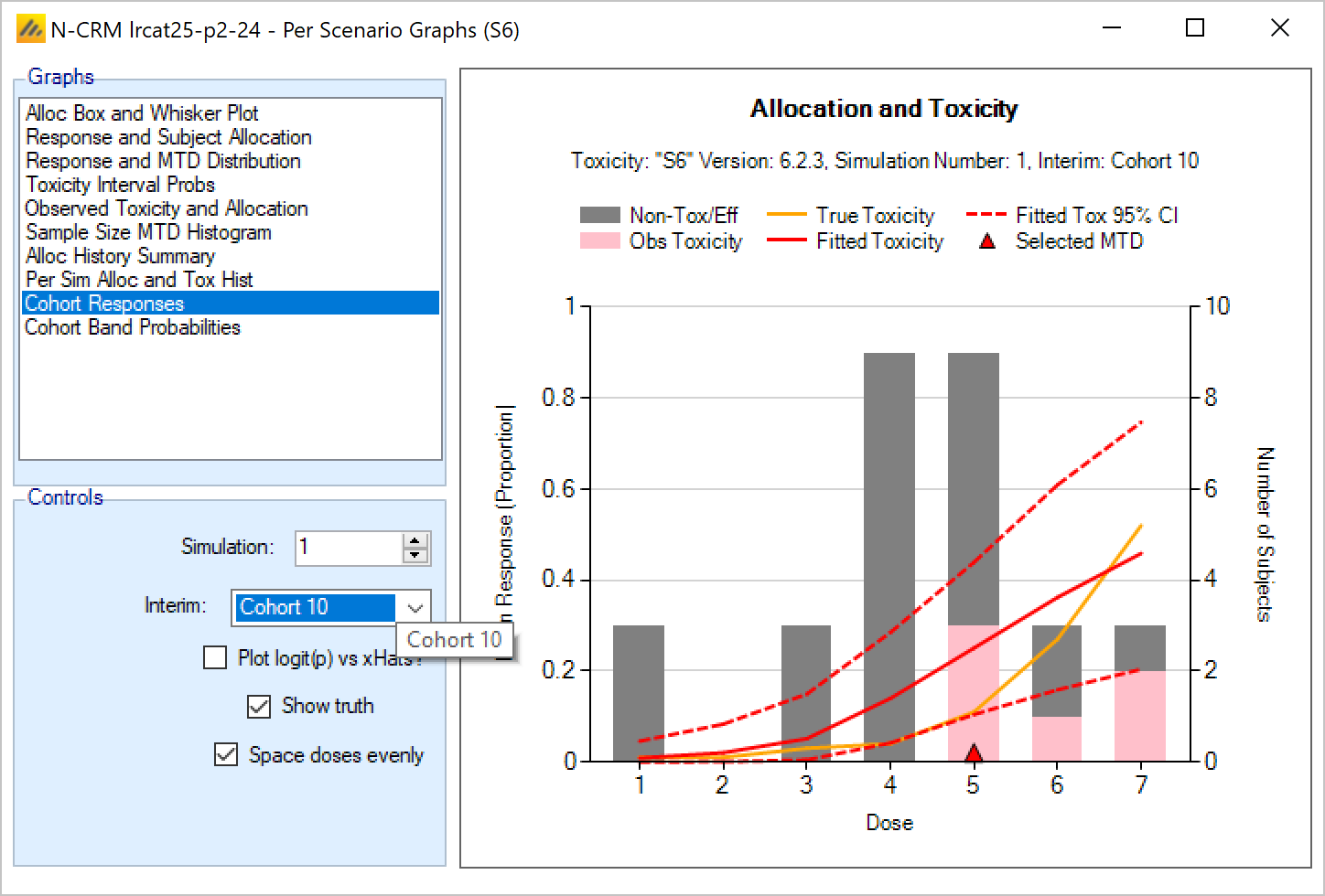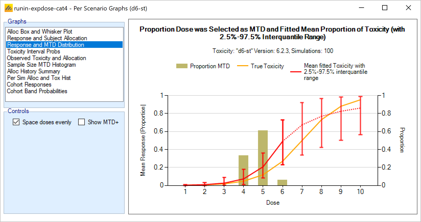 | MTD+ | 1 | The dose index of the model MTD+, this is the model MTD using the dose range extended by one dose either end. Dose 0 will be selected if all doses are too toxic and dose D+1 will be selected if no doses are toxic enough. |