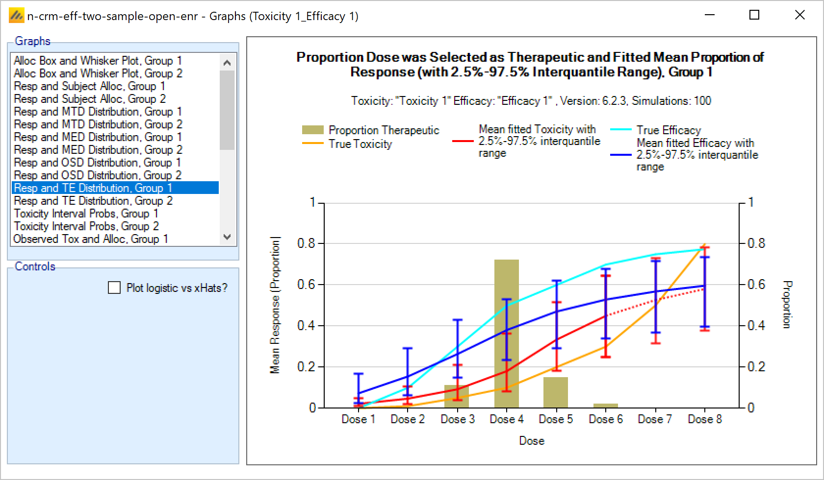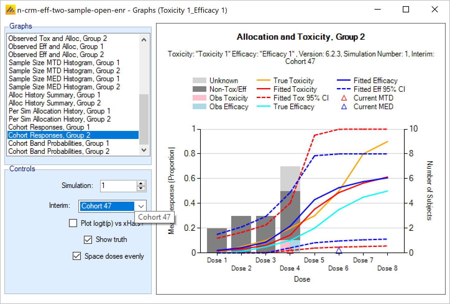 - From CRM (Toxicity) the option to specify that the data is coming from ‘two groups’ and for the toxicity experienced in the two groups to be modelled with a joint model [CRM 2 Sample]. This allows a trial where there are two patient populations (such as adults and children) or where there are two versions of the treatment to be simulated.