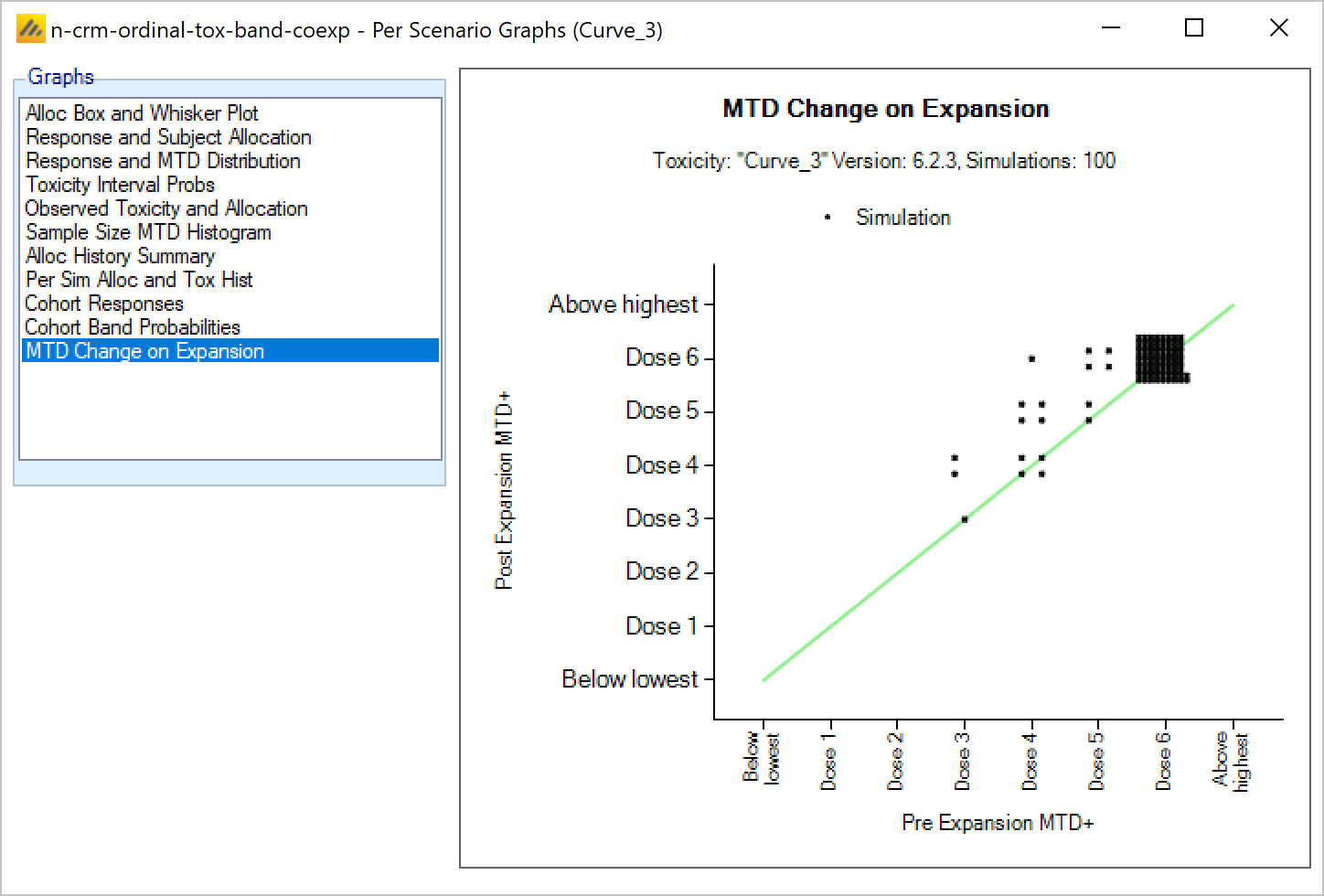 | PostCE MTD+ | 1 – Expansion cohort only (simulations only) | In the case of a trial using an expansion cohort, this is the dose that is the model MTD+ at the end of the dose escalation phase, after the expansion cohort. |