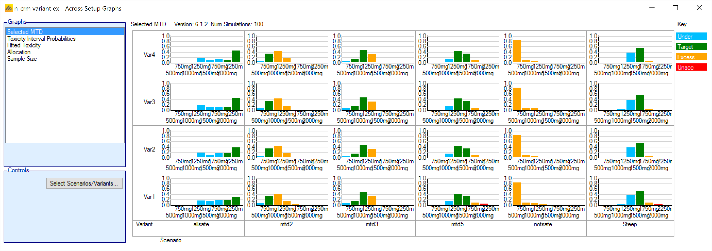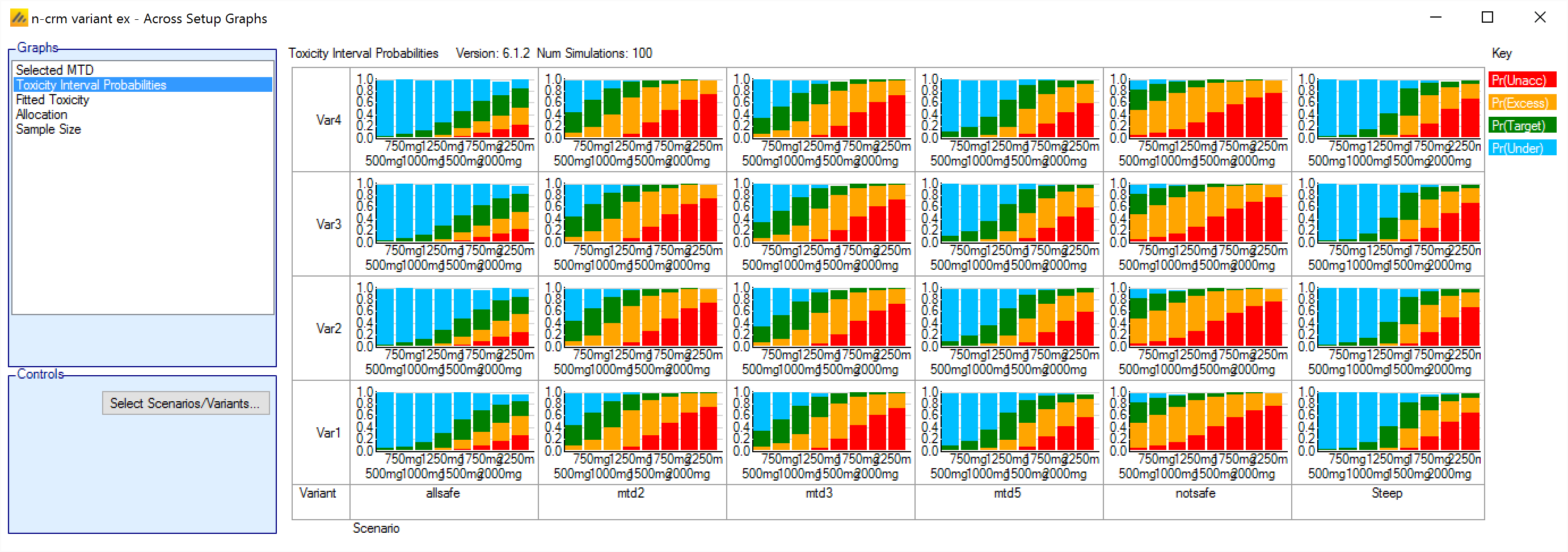 | Pr(Under) Tox <dose index> | One per dose | The posterior probability for each dose that its toxicity rate is in the ‘Under-dosing’ toxicity band. |