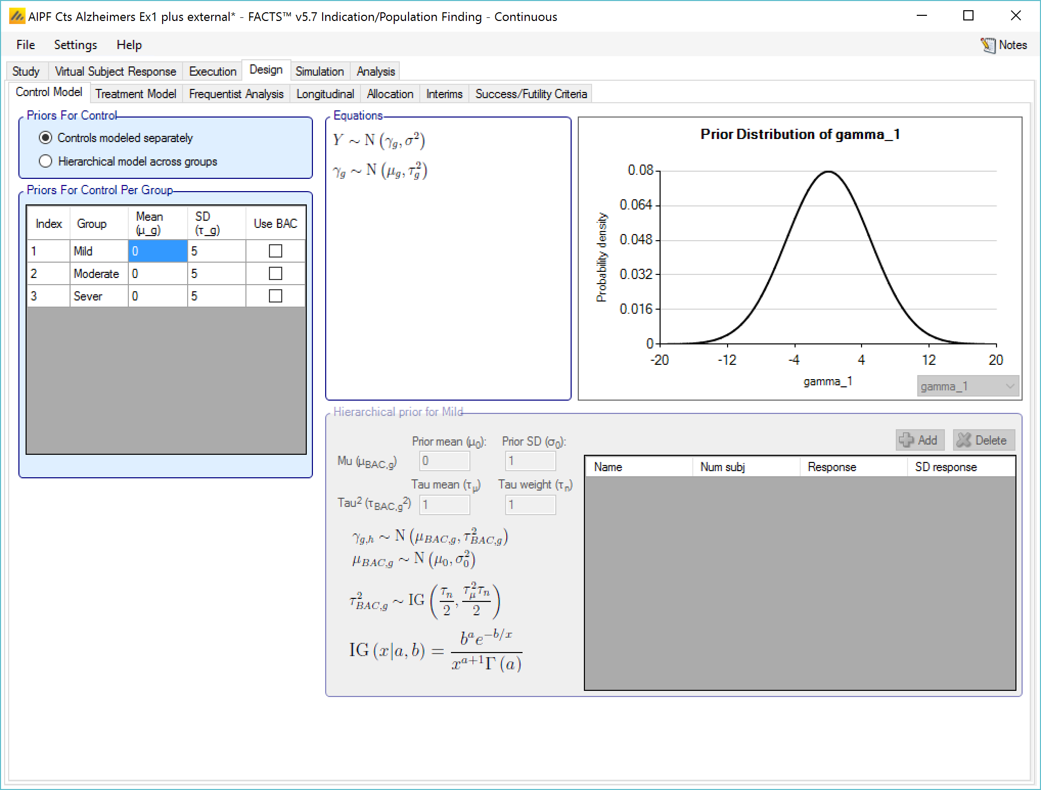 The hierarchical model is a normal distribution of the mean responses (continuous endpoint) or log-odds of the rates (dichotomous endpoint) on the control arms in all the groups. The user enters the priors for the hyper-parameters of the hierarchical model. These are the mean and standard deviation of a Normally distributed prior for the mean of the hierarchical model and the parameters for an Inverse-Gamma distributed prior for the variance of the hierarchical model. As with all Inverse-Gamma priors these can be specified as a mean and a weight or more conventional Alpha and Beta parameters.