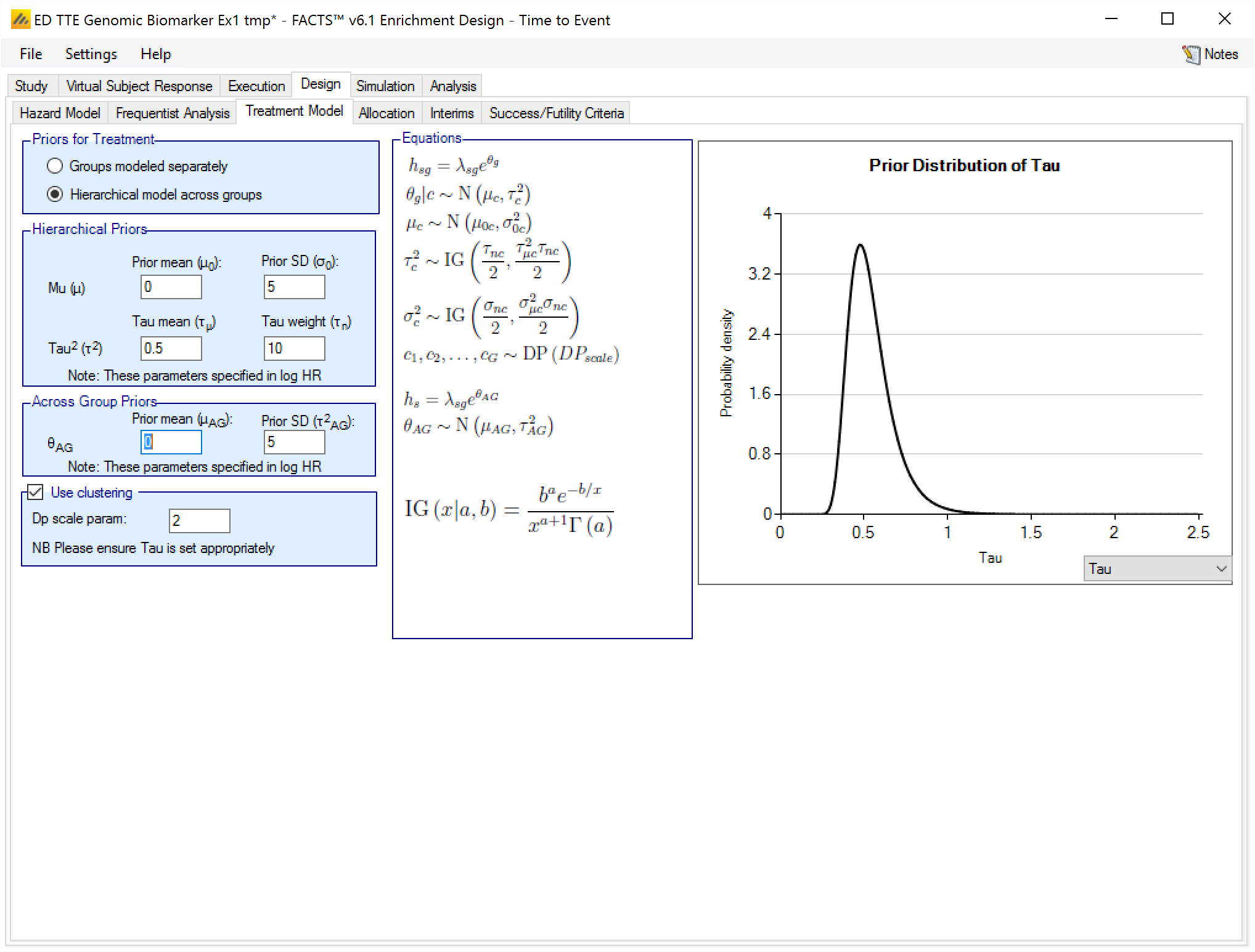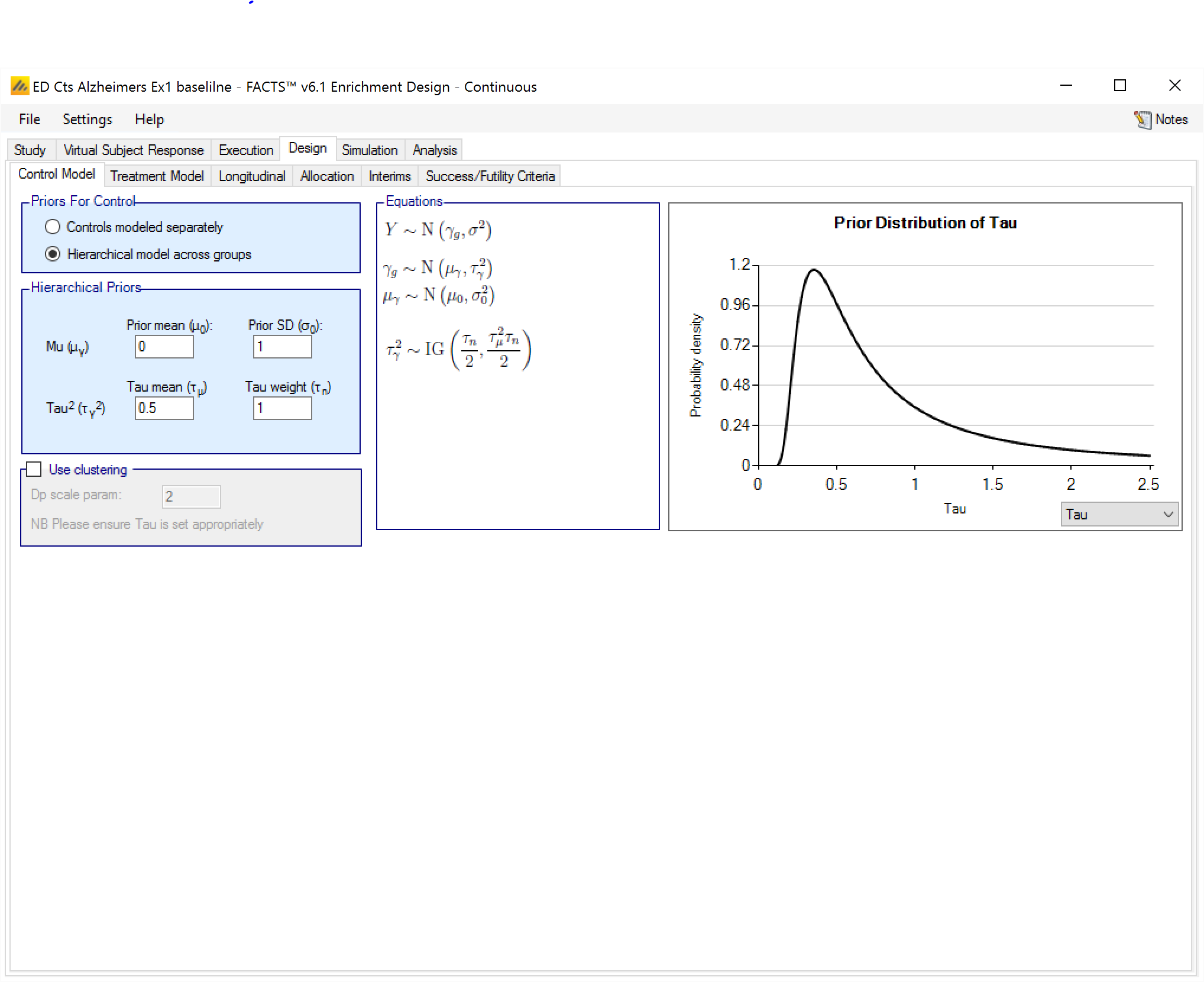 After selecting “Hierarchical model across groups”, if “Use Clustering” is also checked then the specified prior is a prior for an arbitrary number of distributions each providing a hierarchical prior to an arbitrary selection of the groups. As with the hierarchical model, the smaller and stronger the prior is on tau the greater the borrowing, (closer to pooling) and the larger and stronger the prior is on tau the weaker the borrowing (closer to separate analysis). The weaker the prior on tau, the more the posterior value of tau is determined by the spread of the control means in that cluster.