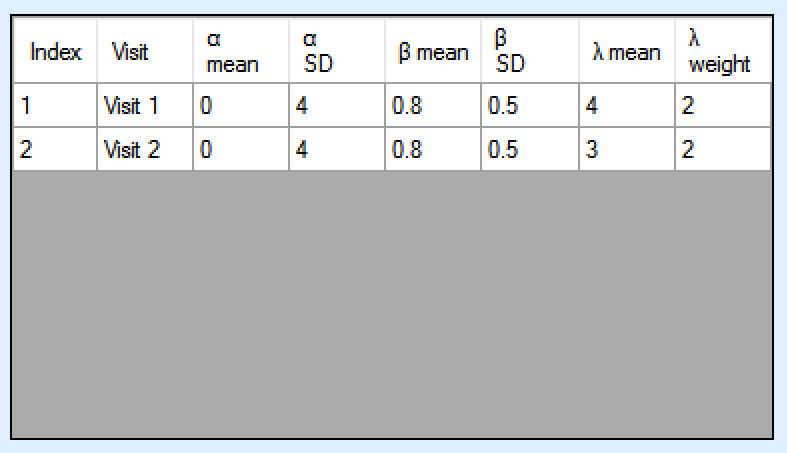 The priors for the model are the equivalent number of prior observations for each outcomes at each visit.