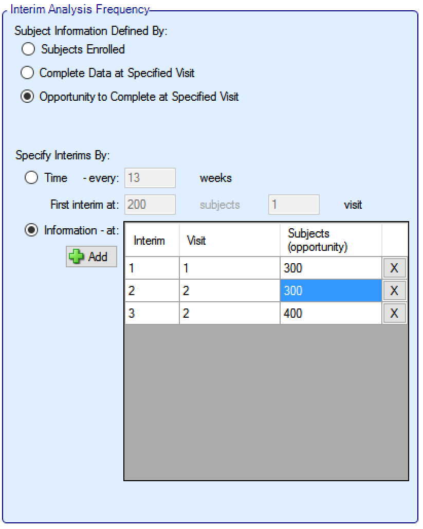 If defining interims by information, then each interim is defined individually, by number of patients/observations and if information is interms of completers, then the week of the visit that is being used to define “complete”. Successive interims must be in terms of the same or more observations at the same or later visit, and either the visit or the number of observations needs to be greater than the previous interim.