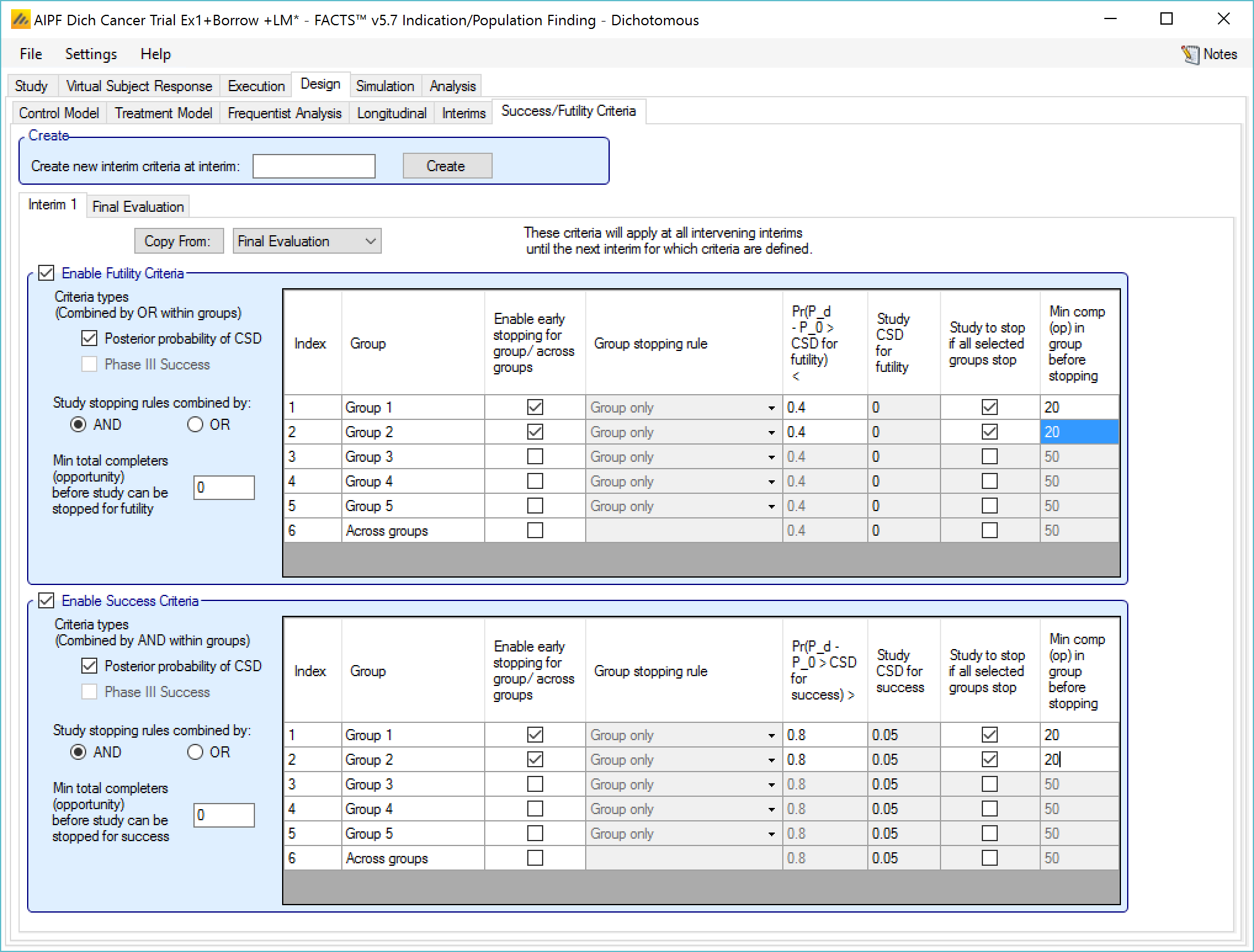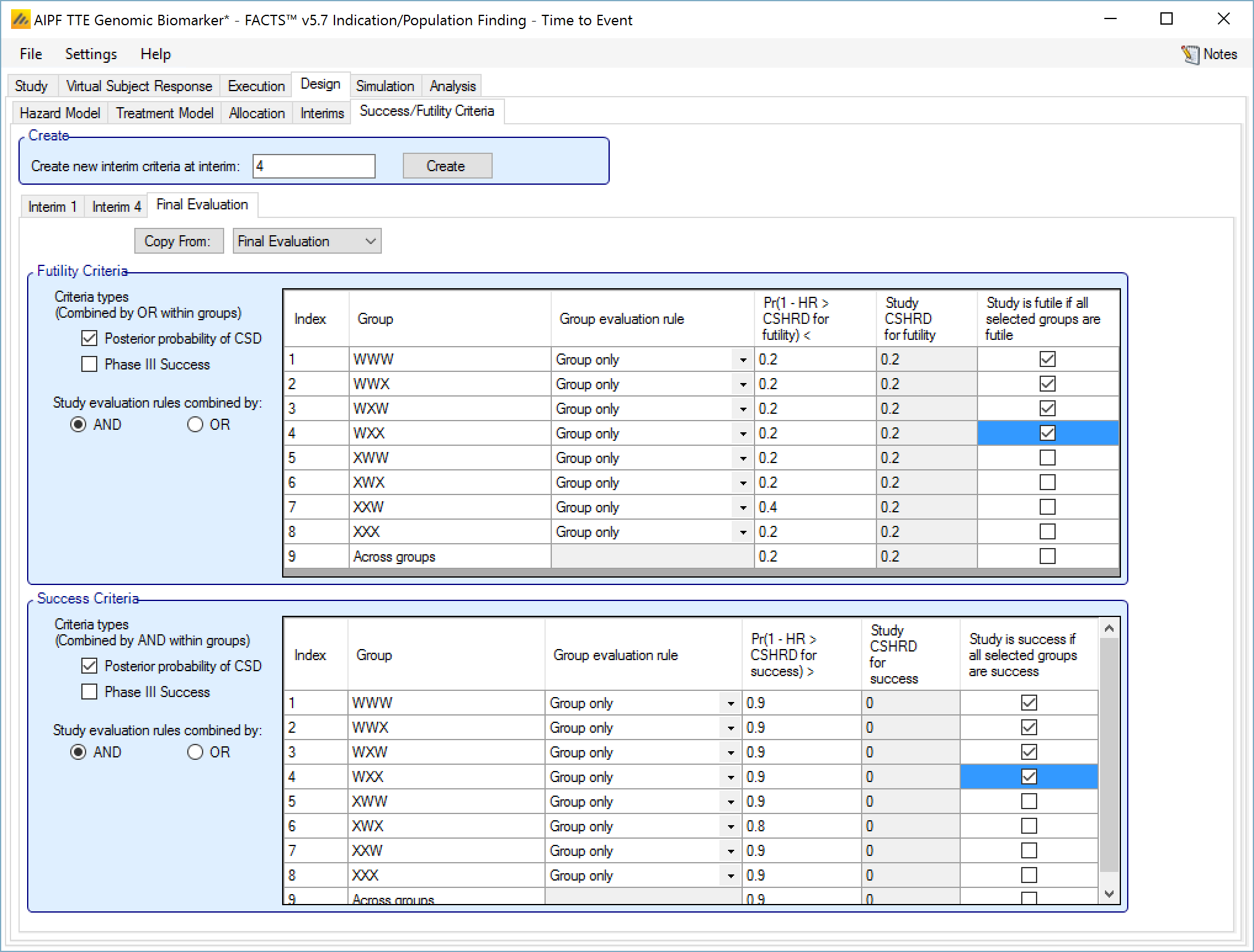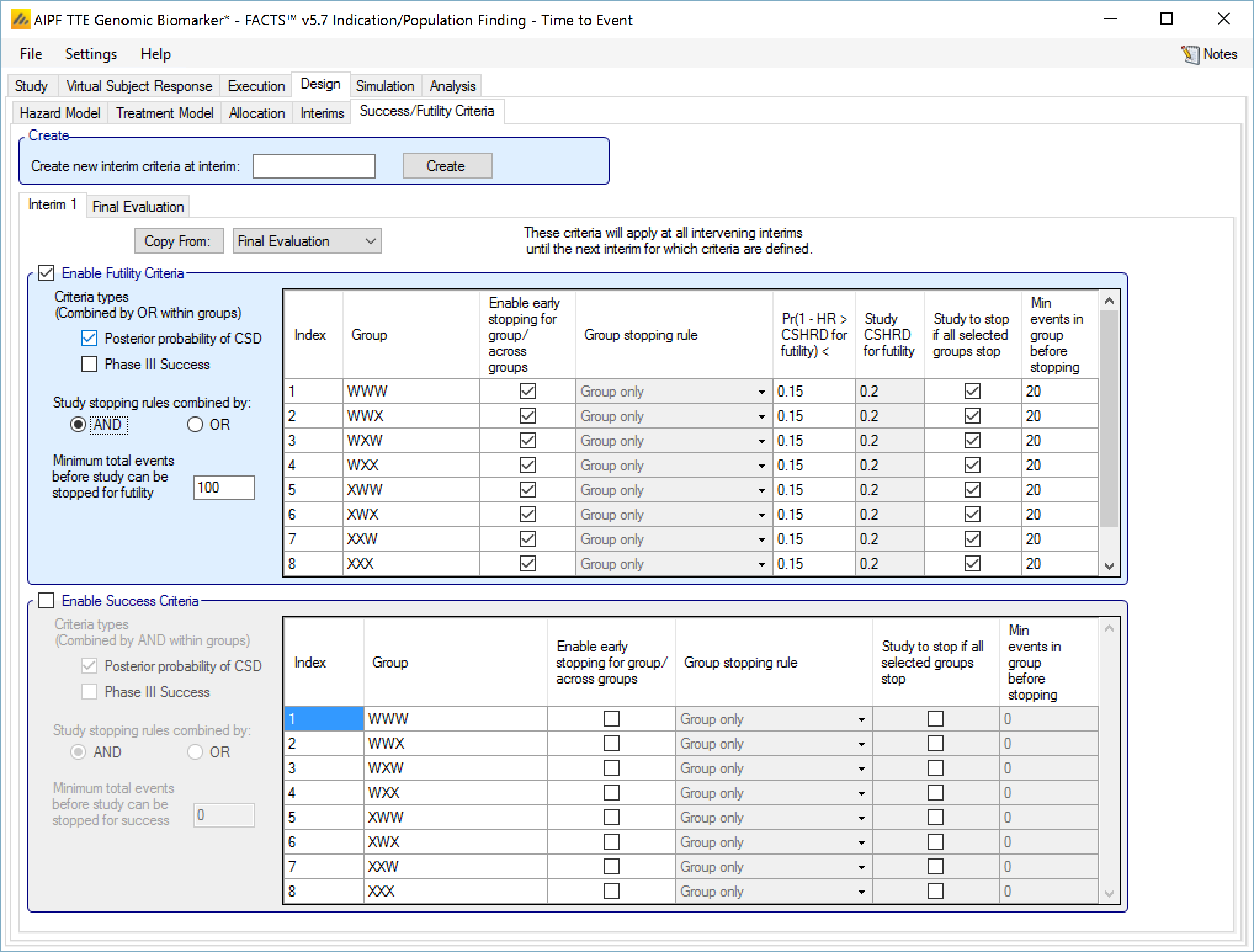On the success/futility criteria page the user can specify rules for judging the study for futility or success at an interim and at the final evaluation. If the trial has no interims there will be just a tab for the Final Evaluation criteria. If the trial has interims then there can be tabs that define different early success/futility criteria at the different interims.