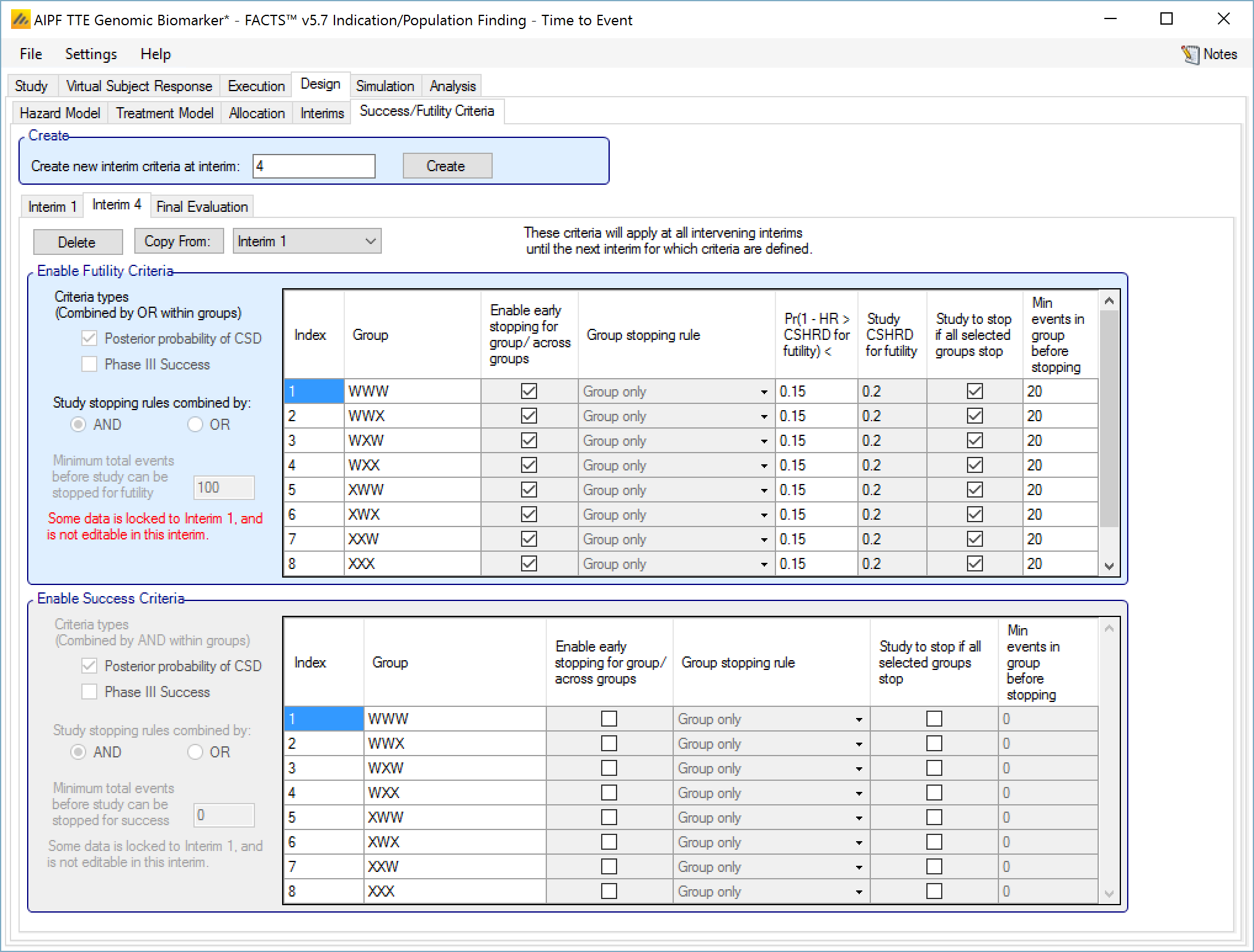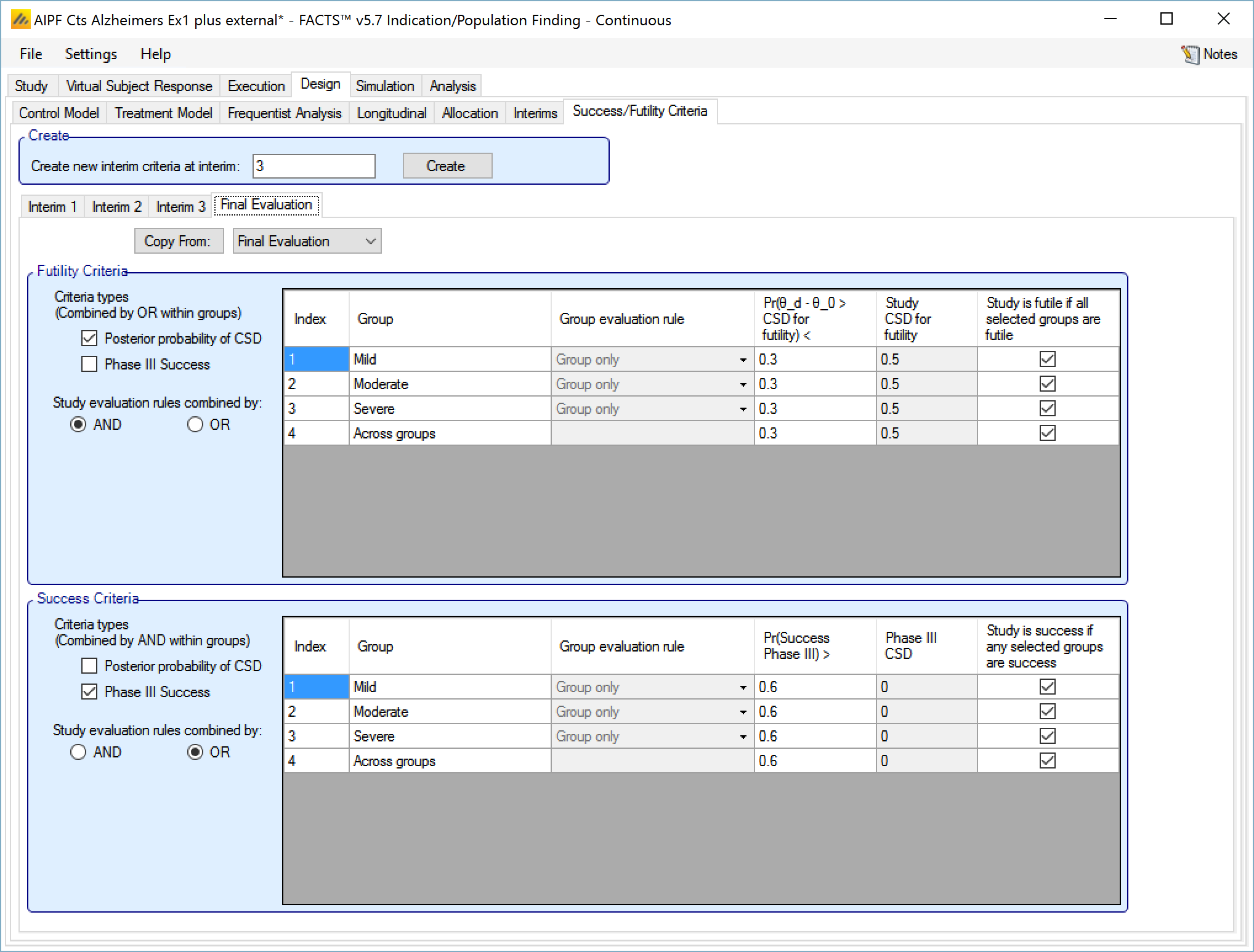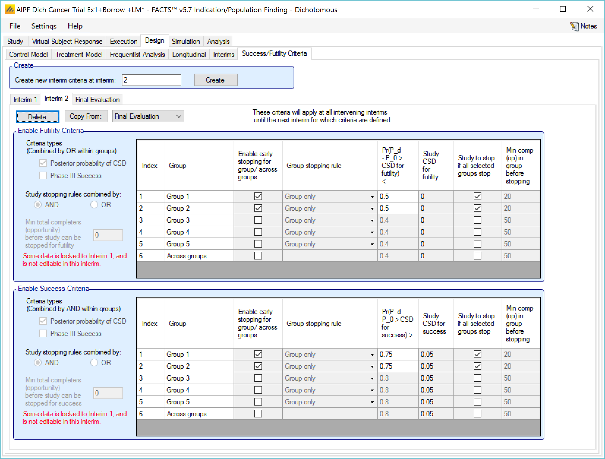 On the success/futility criteria page the user can specify rules for judging the study for futility or success at an interim and at the final evaluation. If the trial has no interims there will be just a tab for the Final Evaluation criteria. If the trial has interims then there can be tabs that define different early success/futility criteria at the different interims.