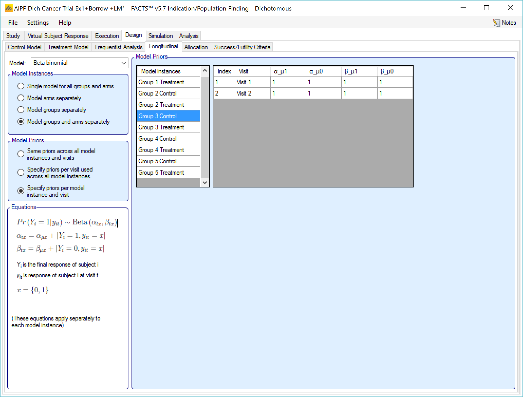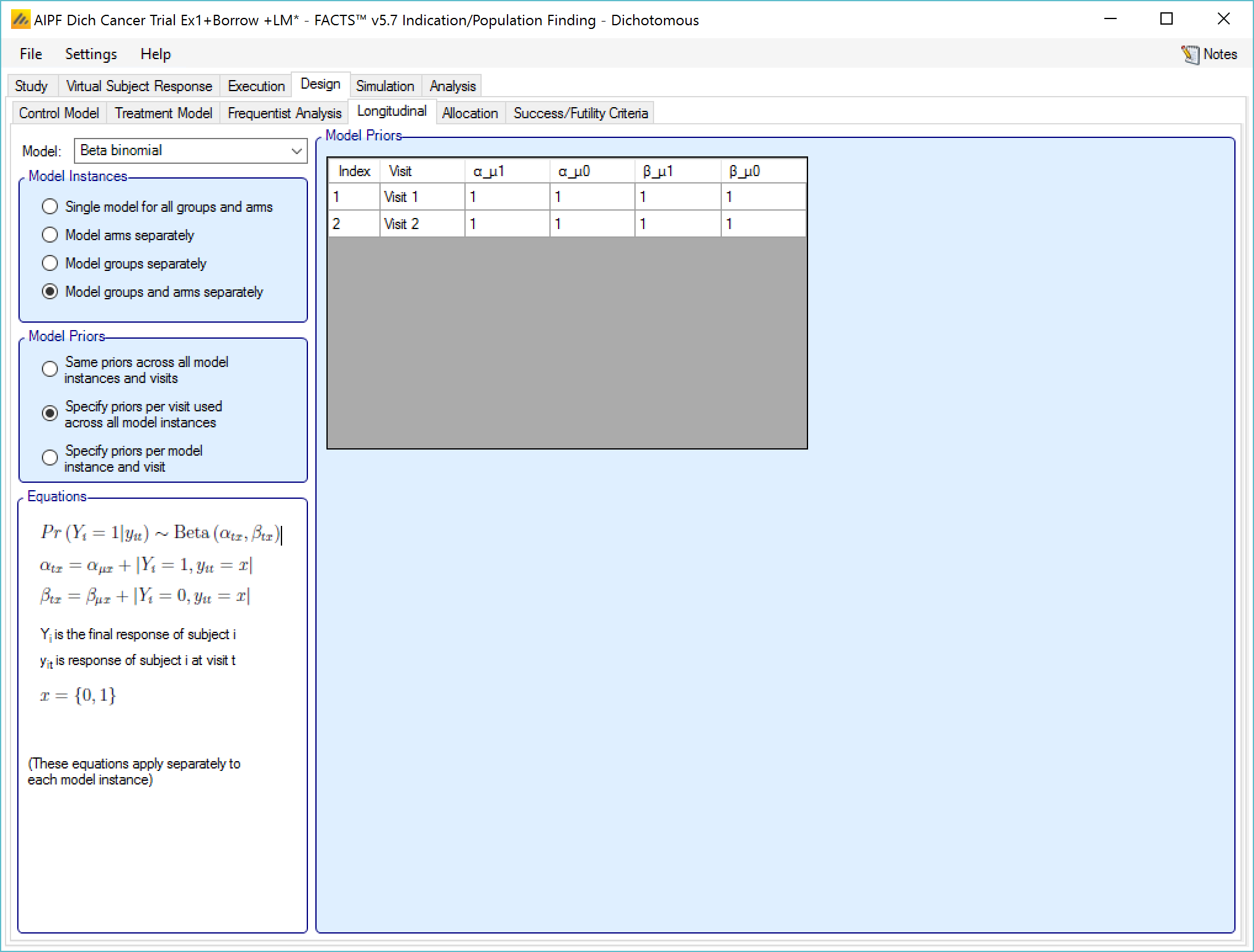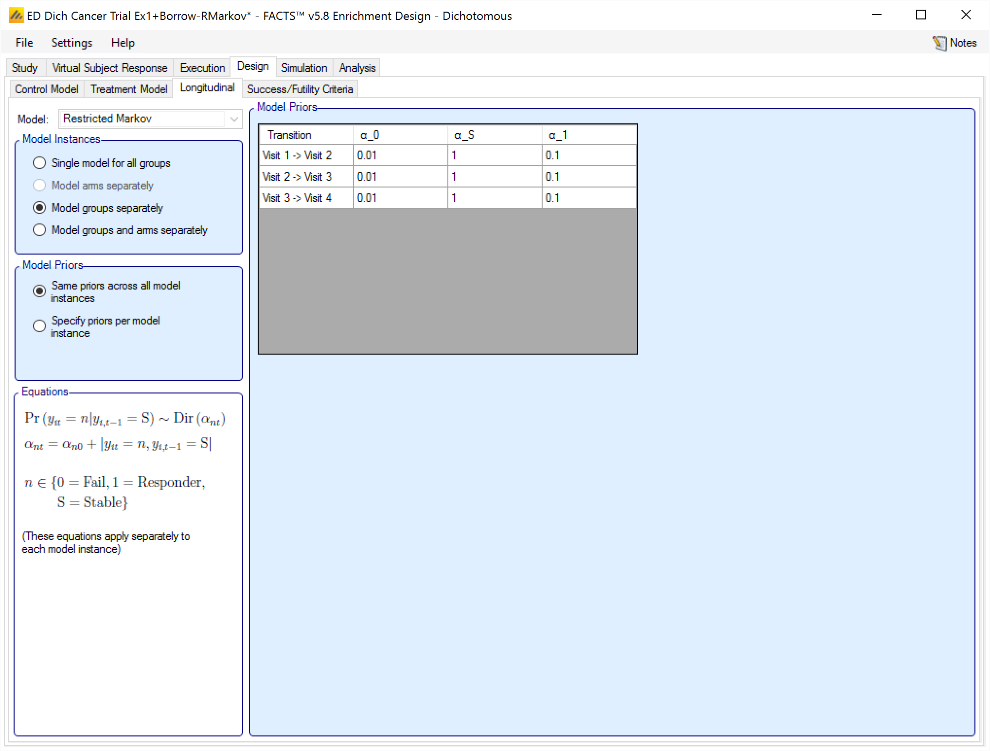 If on the “Study > Study Info” tab the special longitudinal feature of a “Restricted Markov” model has been selected, then a “Restricted Markov” longitudinal model must be used in the design to analyse subject data. The Restricted Markov model is similar to the Beta Binomial model except it uses a Dirichlet prior that models the probability of one of a number of outcomes for each subject at each visit – in this case three: Success, Stable and Failure.