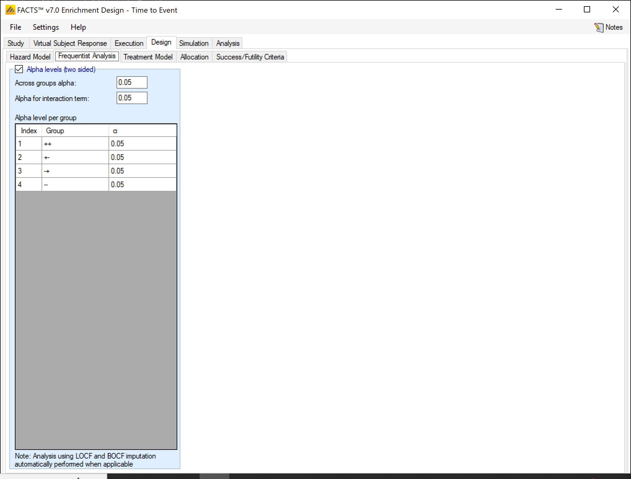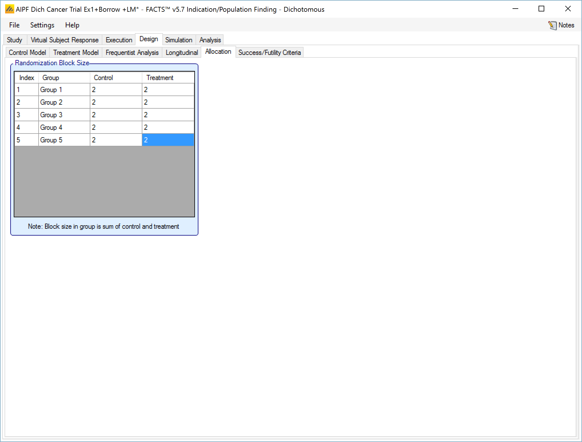 The Design Tab allows the user to specify how control responses, treatment responses and longitudinal responses are modeled, how subjects are allocation, the timing of interims, and the criteria for stopping groups or the study for early success or futility, and the criteria for judging final success or futility of each group and the study. Wherever applicable, this user guide is separated by type of endpoint used (continuous/dichotomous or time-to-event).