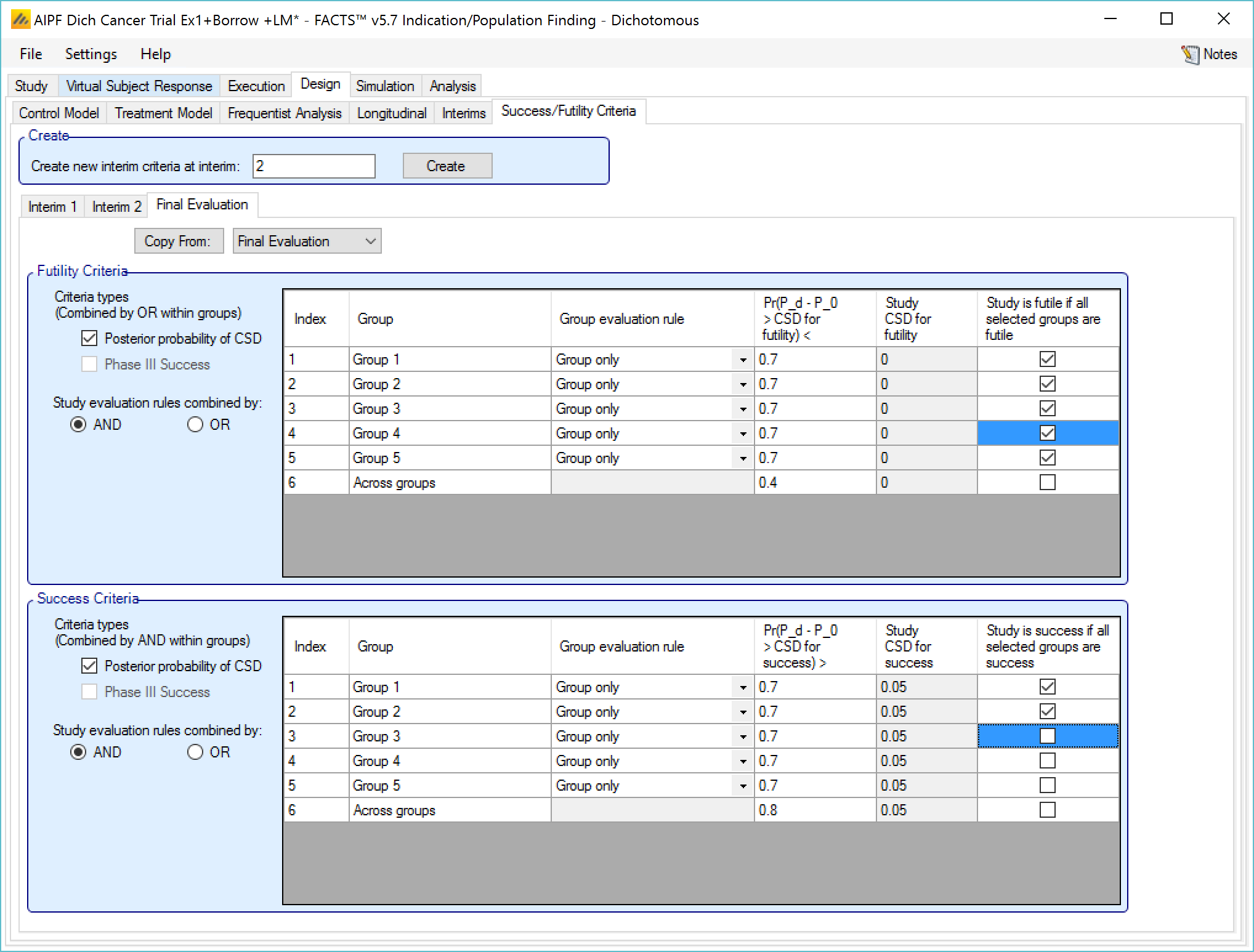 On the Final Evaluation tab of the Success/Futility Criteria tab page the user specifies the rules for judging whether individual groups and the overall study were futile or a success should they not stop early.