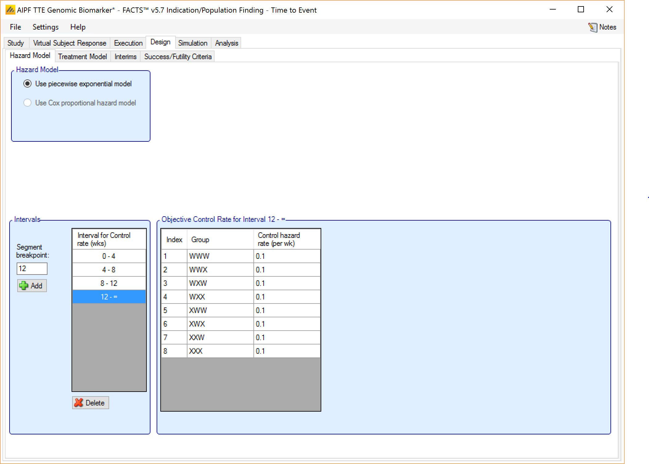 If on the Study > Study Info tab, ‘include historical control’ has been selected then the control model is simply the hazard rate on control in each group. Different time segments can be specified for the hazard rates independently from time segments used elsewhere such as on the Virtual Subject Response > Control Hazard Rates, Dropout or Treatment Model tabs. And then the hazard rate must be specified for each time segment for each group.