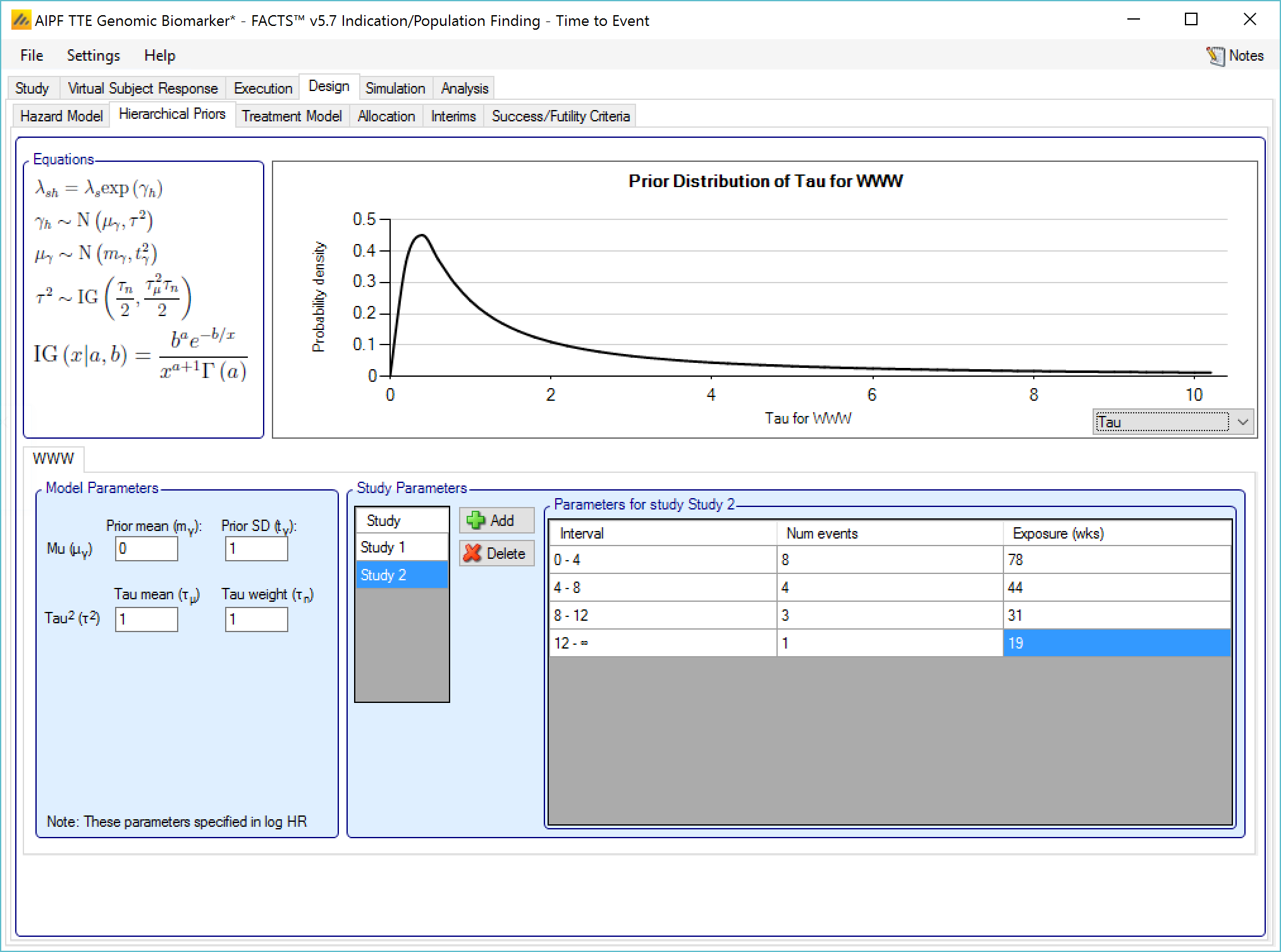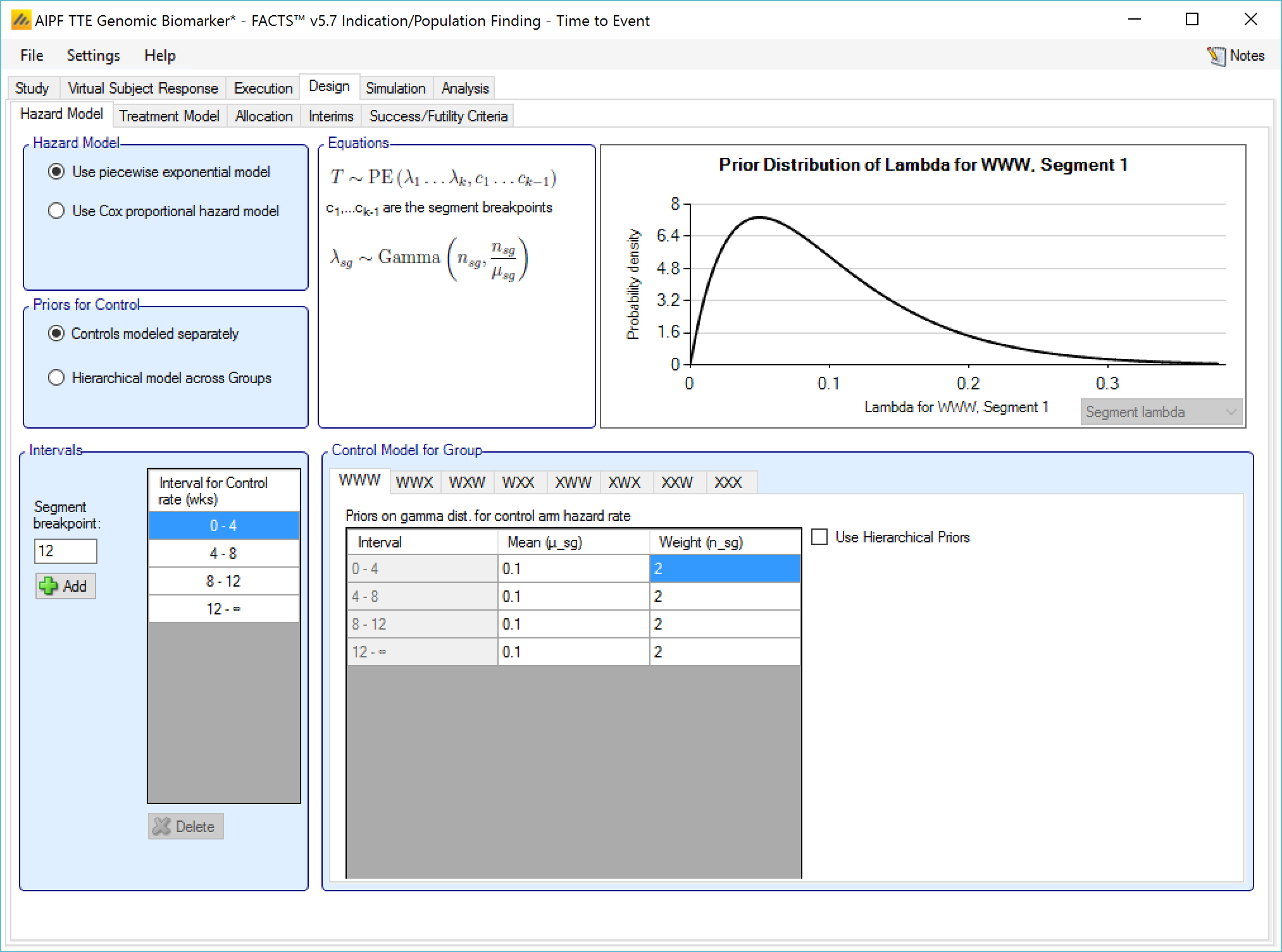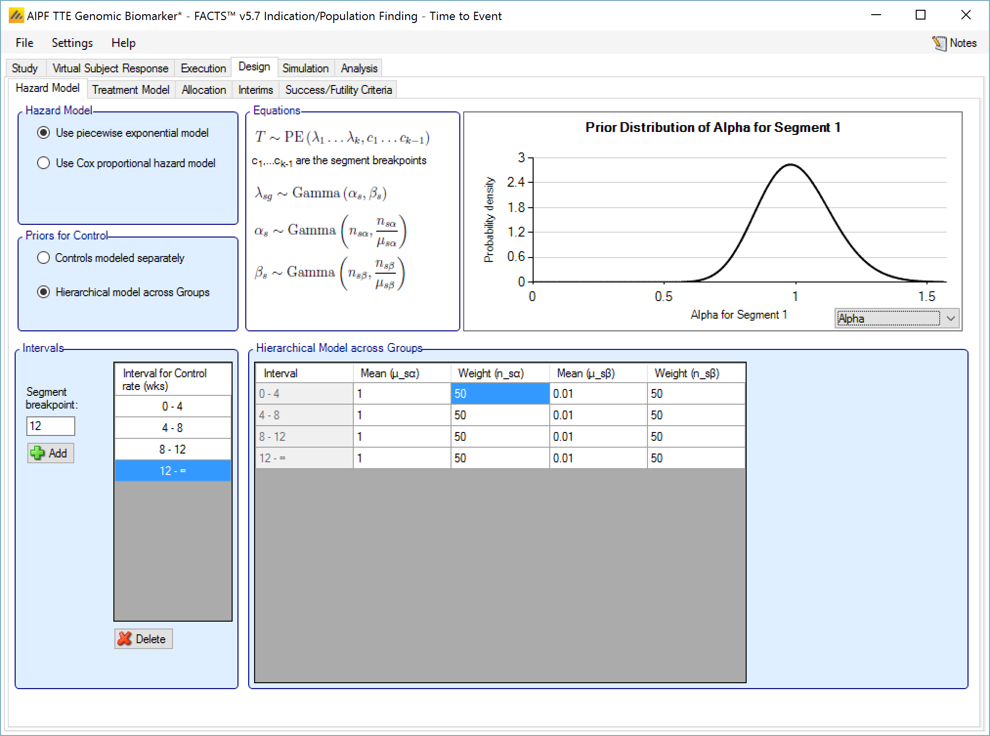 If Hierarchical Prior for Control is specified for the control arm in a group, then in addition to the segment intervals (common across all groups) and the parameters of the Gamma prior distribution, then on a separate “Hierarchical Prior” tab the user specifies: