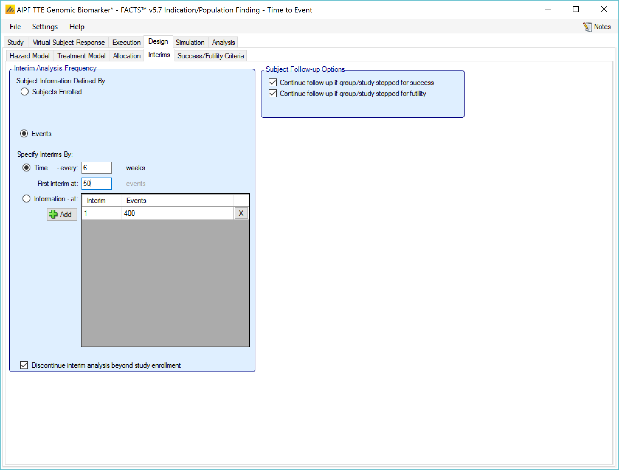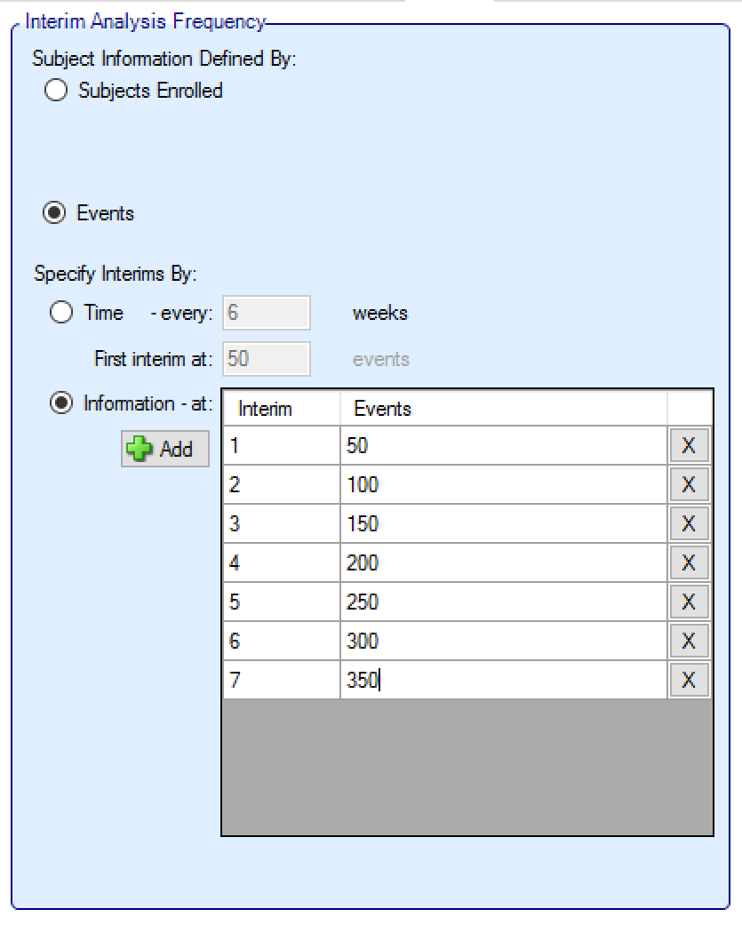 If the trial is adaptive, there is an Interims tab, where the user specifies when interims occur. Interims can either be specified with calendar frequency, occurring every specified number of weeks, or specified to occur after a specified amount of information has been collected.