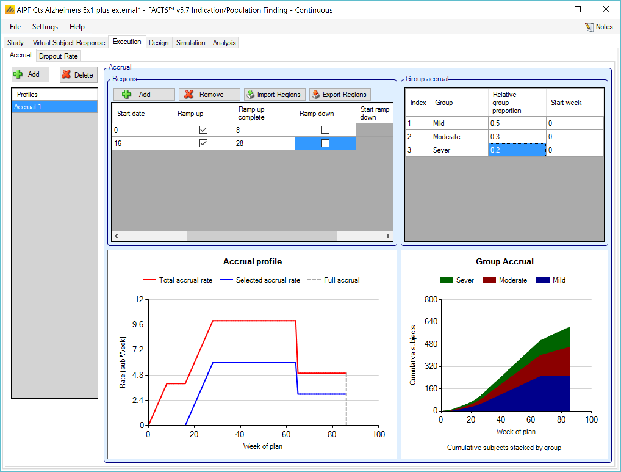 The Execution tab allows the user to specify profiles for subject accrual rates and dropout rates.