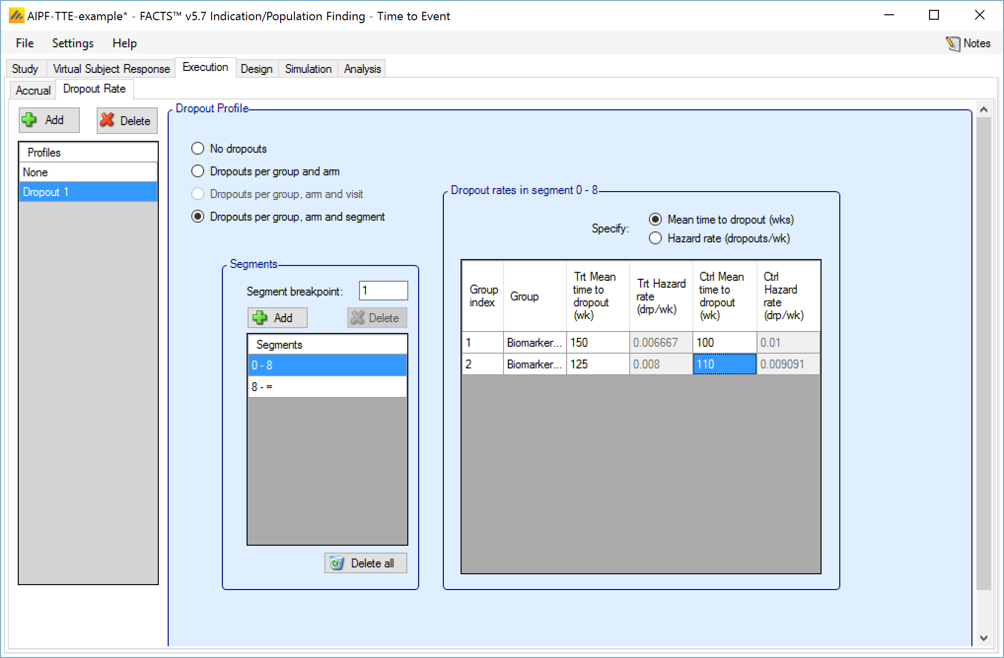 Dropout rates can be specified either by the mean time or a hazard rate (in weeks). When specified by group and segment, a set of dropout specific time segments can be entered; these do not have to match the segments used in defining the control hazard rate (or segments used in the design).